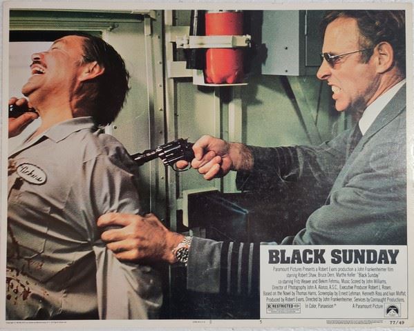 Black Sunday (Paramount Pictures, 1977) lobby card. Action, Mystery. Starring Robert Shaw, Bruce Dern, Marthe Keller, Fritz Weaver, Steven Keats, Bekim Fehmiu, Michael V. Gazzo, William Daniels, Walter Gotell, Victor Campos, Joseph Robbie. Directed by John Frankenheimer. Minor edge wear, minor creases. Excellent. (11"x14").