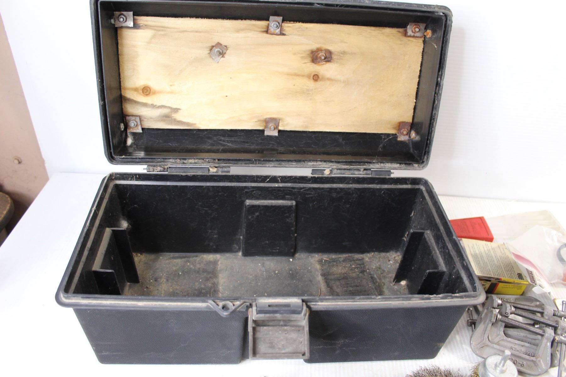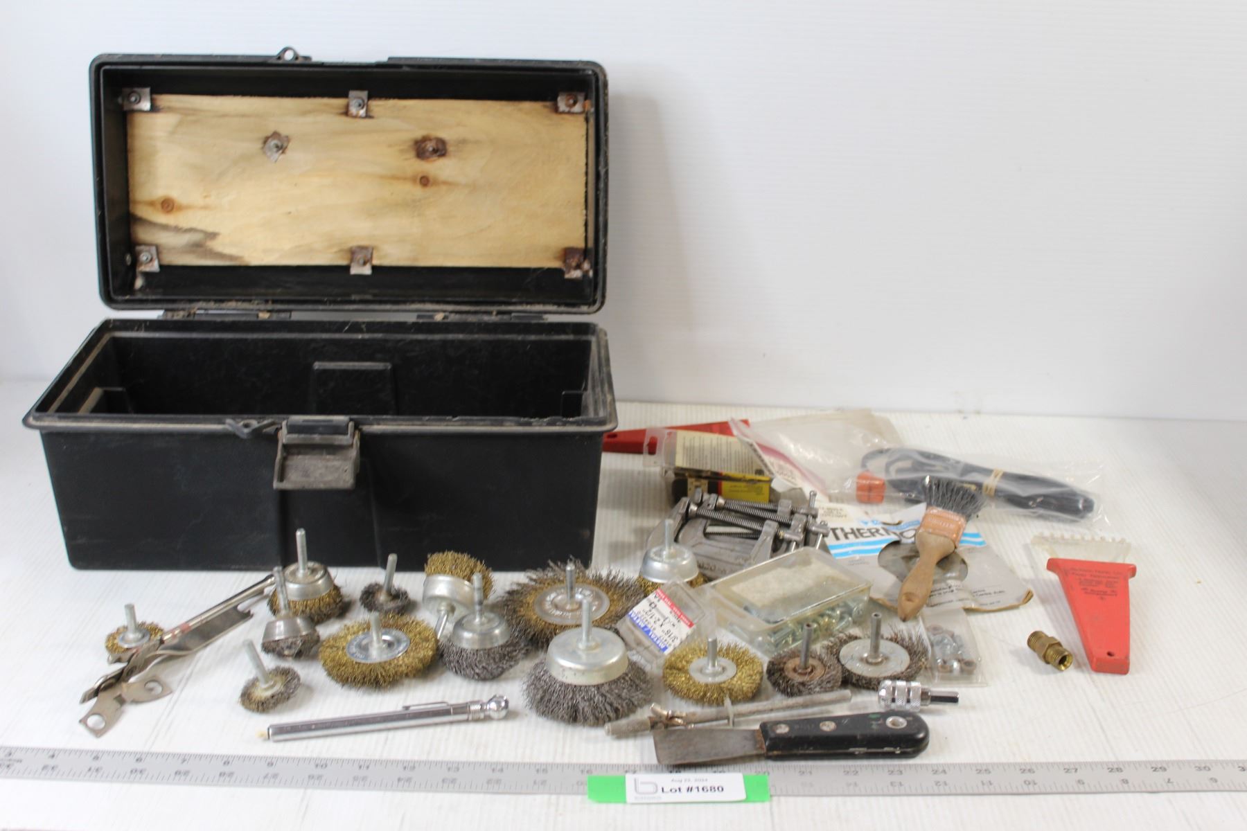 Black Toolbox, Assorted Wire Brushes, Metal Scraper, Metal Clamps, Assorted Cleaning and Garage Equi
