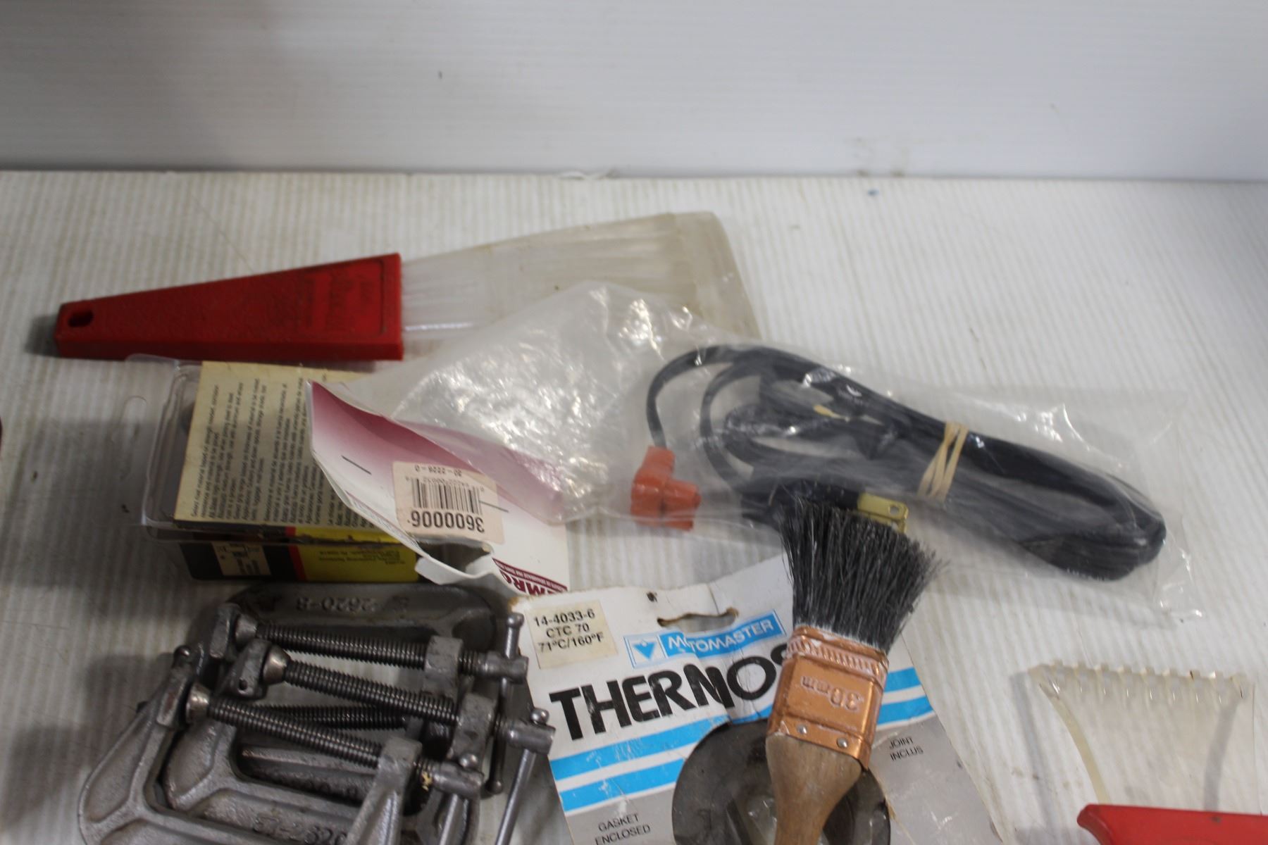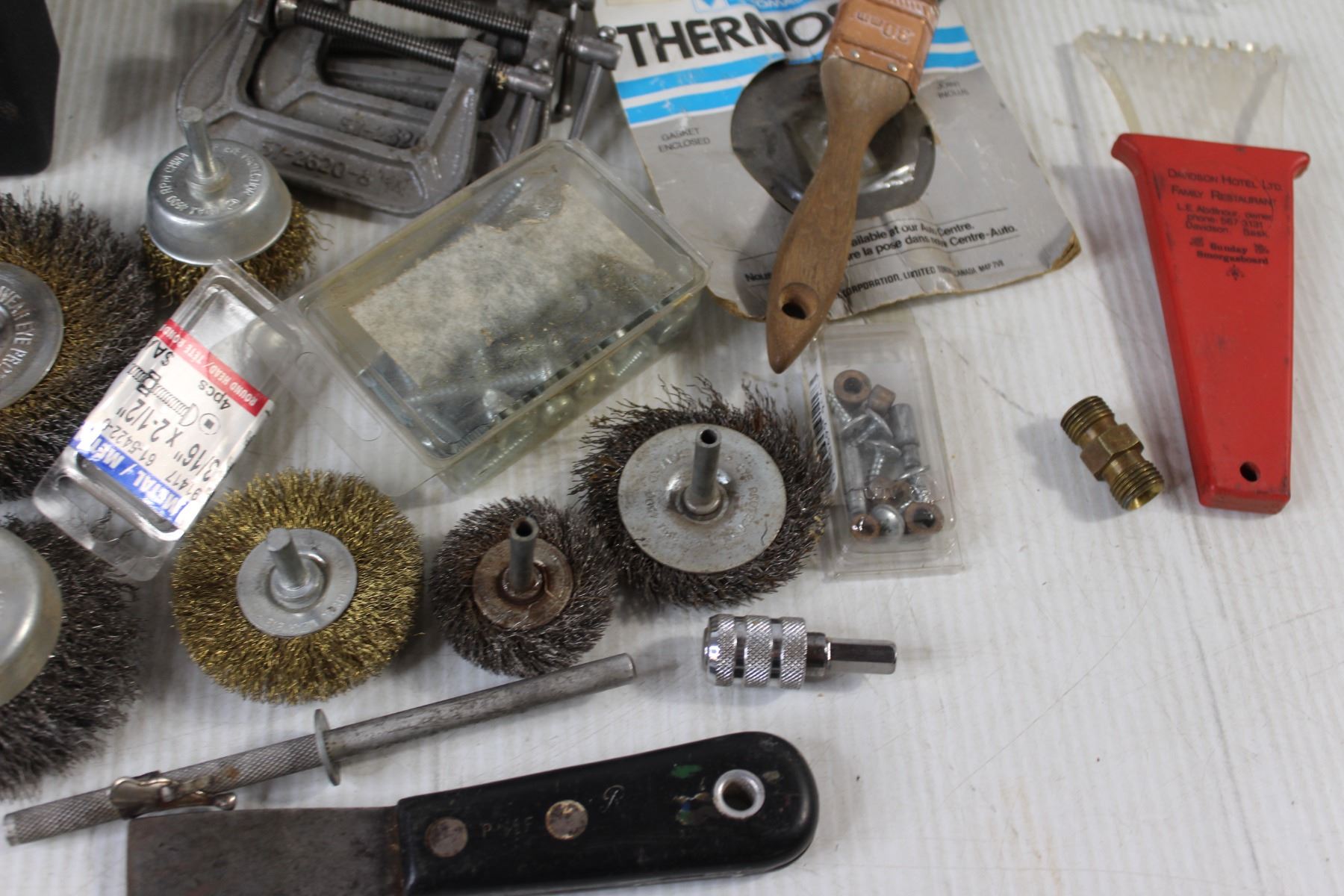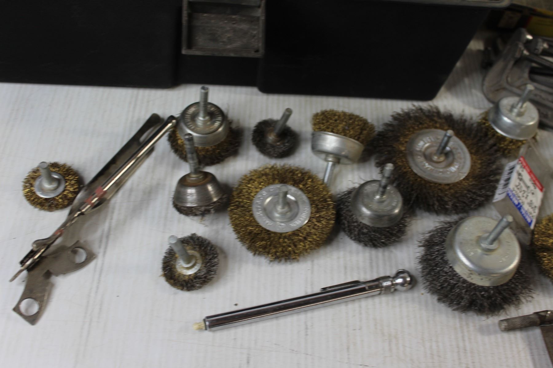 Black Toolbox, Assorted Wire Brushes, Metal Scraper, Metal Clamps, Assorted Cleaning and Garage Equipment