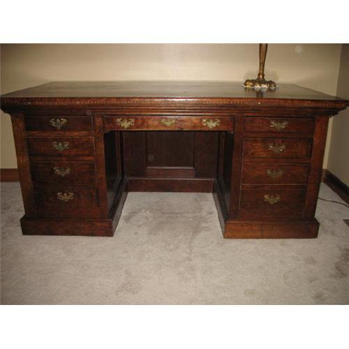 Outstanding & One of a Kind BLACK WALNUT Executive Bankers Desk.The black wanut wood is very rich looking! It is so rare that I have never seen anything even close to its Beauty & Quality after collecting 34 yrs.I have had it in my home for the last 10+ yrs-in the family room-its that magnificent.It was manufactured in the 1920's when people built expensive homes.This desk was built for a bank president.It has very thick black walnut wood.The constuction of the base is very unusual-it utulizes large pegs for each board for strength.(true quality) The top measures 6 ft.1/2 inch in length x 37 1/2 inch in depth.The height is 32" high.It has 4 drawers on the left side(21 in.deep x 15 in. wide)-even the sides and bottom of each drawer has walnut wood.The large middle drawer is 27" wide x 21" deep.It has 3 drawers on the right side-the bottom drawer is your deep file drawer.This fine desk has the original brass handles on ech drawer.The desk is finished on all sides-including inside where your place you legs(another sign of quality).The sides and the back side have deep picture frame inset construction(3 in. deep)-very rare!.It really makes the desk stand out.This beautiful desk can be placed anywhere in a room.In addition,it has 2 pullout writing areas on each side.They measure 24" long x 14 1/2" wide.They are very ornate and are of solid wood black walnut wood-beautiful matching grain in each piece.It even has a very large pullout (24"w x 21"d) on the back side where clients would ...