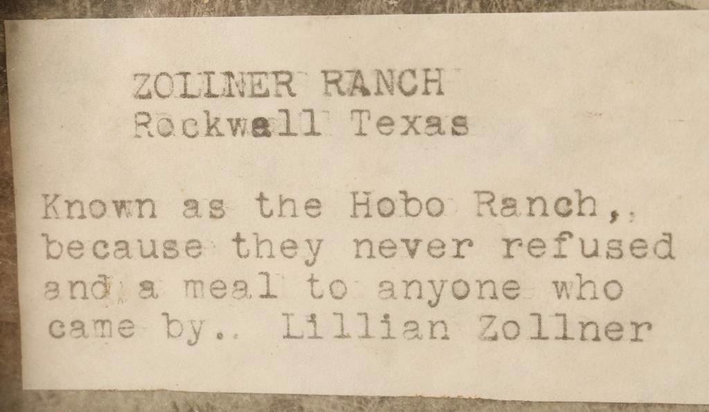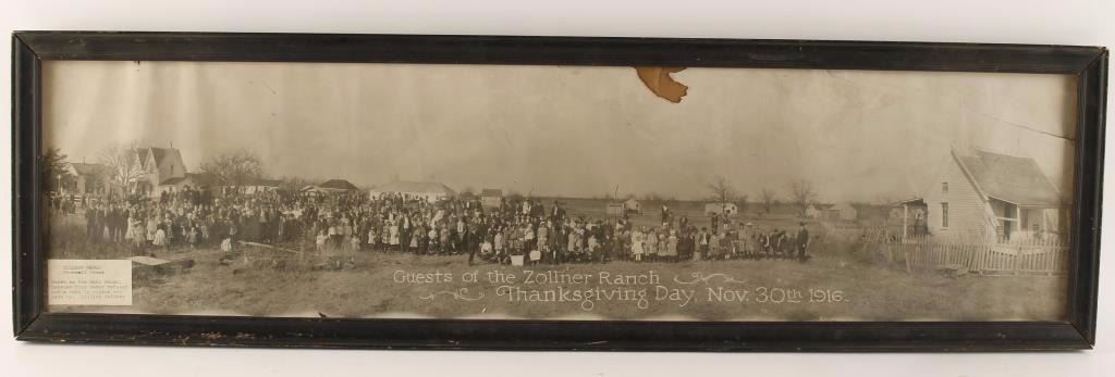 Marked and identified "Guests of the Zollner Ranch, Thanksgiving Day, Nov. 30th 1916". Hobo ranch is known for never refusing a meal to anyone who came by-Lillian Zollner. Image measures 34 3/4"x8 1/2". Shows age, some tearing and part of photo missing at the top.