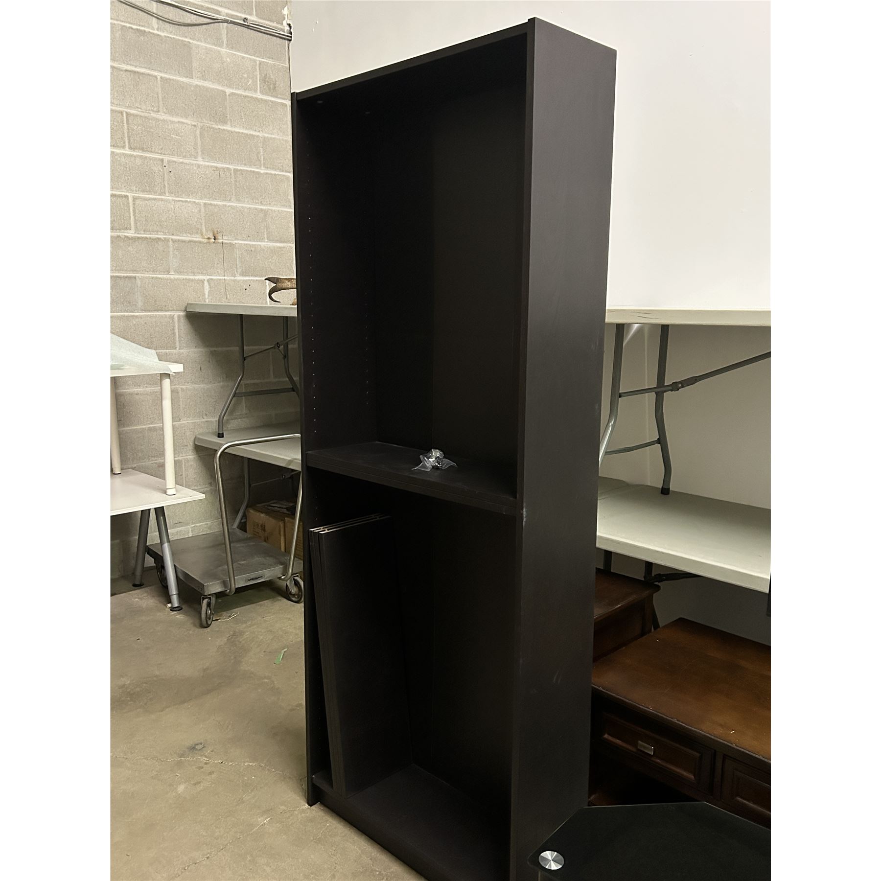 With 3 extra shelves and hardware to be attached. Stands 80” tall by 31.5” wide and 11” deep.