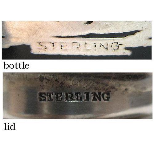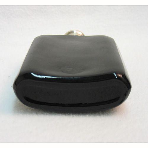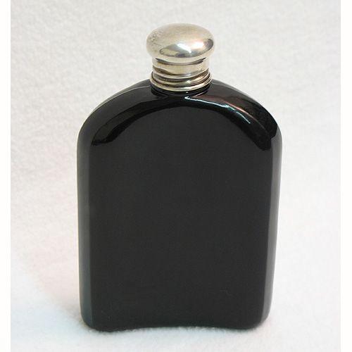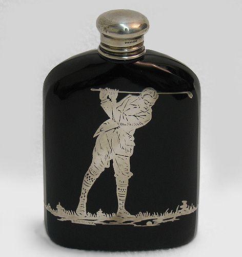 Black amethyst glass flask with sterling overlay of golfer; screw-on sterling cap; impressed sterling below right foot of golfer and on lid; C.1900; 5 1/2 inches high x 3 1/2 inches across x 1 1/4 inch deep (no visible defects)