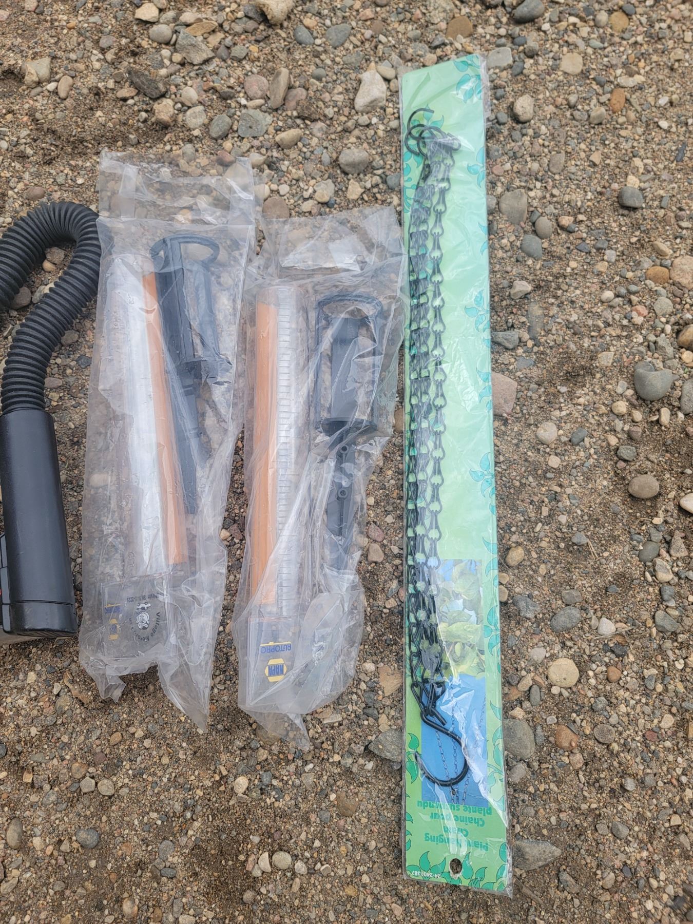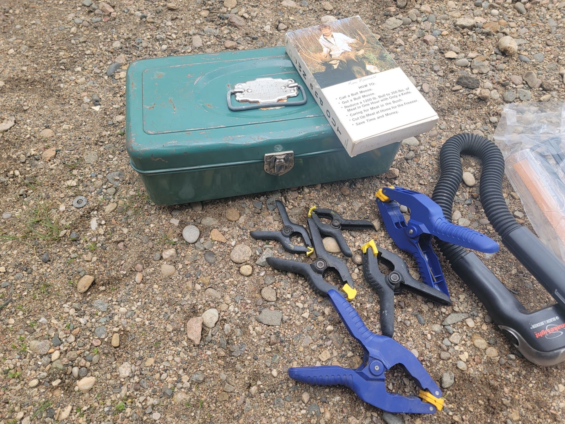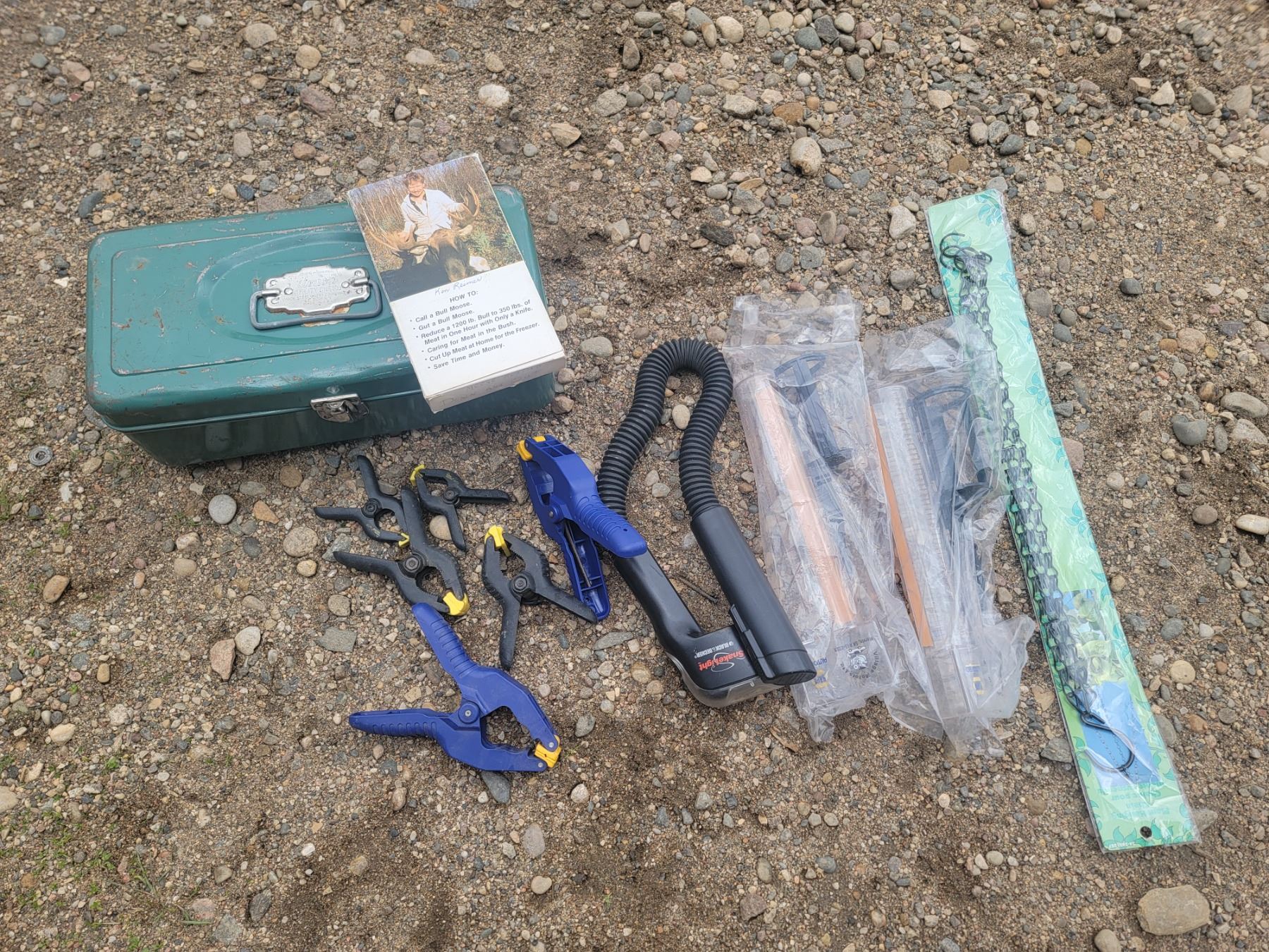 "Black and Decker" Snake Light, Tin Box, Rain Measurers, 6 Assorted Clamps, Hunting VHS