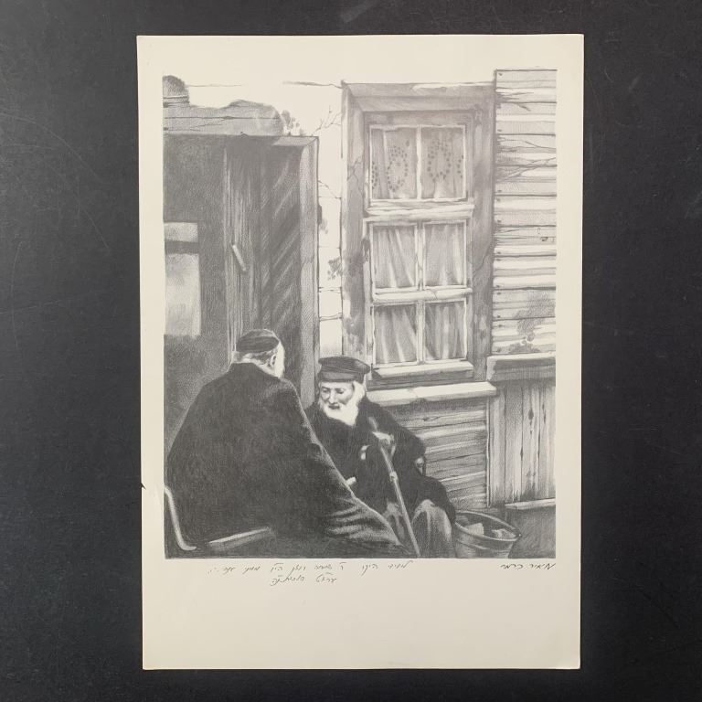 Black and White Israeli print. Two men sit outside a home. Signed and titled. There is a small tear in the left margin but does not affect the image. It is in good condition.