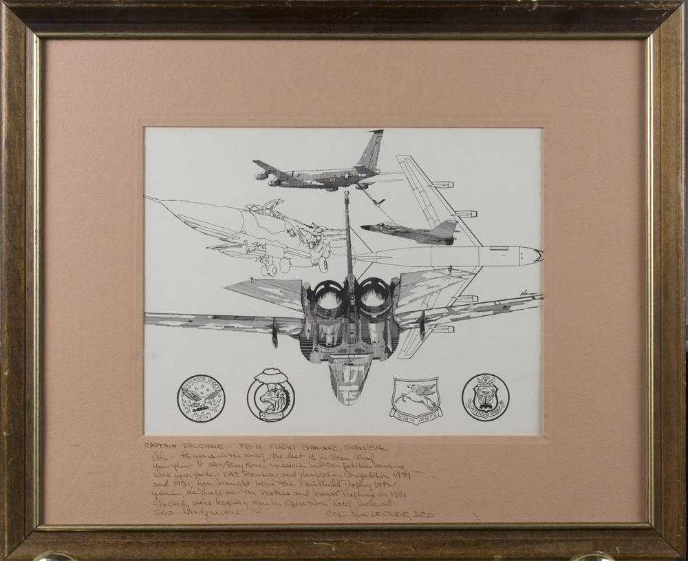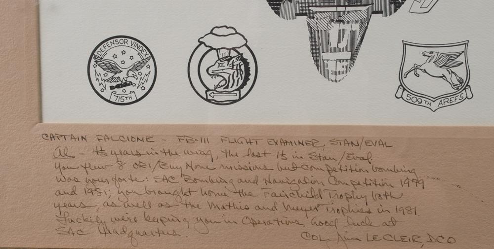 Depicting aircraft with presentation notes to Captain Falcione FB-111, from Col. Lecleir, DCO. 10" H x 13" W, matted and framed behind glass.