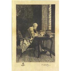 Black and white print onto silk gentleman at desk with books and quill pen, 37cm x 24cm