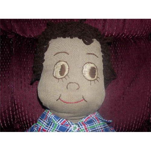Homemade black cloth doll from a pattern. He is cotton stuffed.The maker printed on the back of the doll Made by Ruth Endricks 1951. I'm sure he was made from a pattern that was available as I have seen others with similar features. He has red embroidered lines to indicate toes. His face is adorable. He's made of a heavy tan/lighter brown cotton material. He has brown year for his hair. The only seams that are open are on both sides of his neck. You can added a few stitches and he's be a good as new. What a great thing to have him signed by the maker and dated. He is from a smoke free environment. Buyer to pay $12 for shipping, insurance and handling. Thanks for viewing.