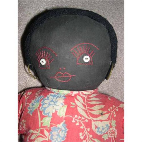 This is a wonderful earlier black cloth doll. She is 19 1/2" tall. There is some fade to the top part of the dress. In the back there are 3 of the very old black buttons to secure the dress. The apron has a few stains on it but I would think they would wash out. She has on a pair of pantaloons. This doll is cotton stuffed. Her features are great. They are handstitched in red thread. She has the tiny while pearlized baby buttons for her eyes. She has her old clothes. She has a red cotton print dress that has a rip by the one arm and a few slits in the top from age. She has large metal hoop earrings. She has black yarn hair. I see one stain area on her lower cheek, probably water or from a kiss! For her construction there are two darts coming up from the neck into the cheek area. She is cotton stuffed and has mitten type hands. She has straight legs with no definition for feet. The has her legs sitched so she is floppy and can sit. Her arms are also attached to they can move a little. There are not that many black dolls that survived through the years that represents the wonderful time when people made play toys.
