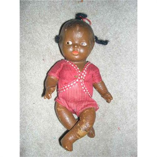 Here is a 10" composition black baby doll. It has crazing an lifting of composition. There are the 3 tufts of hair in varying conditions. She has the strung on arms and legs. I believe her outfit to be original. She is sold as is. Doll is from a smoke free environment. Buyer to pay $10 for shipping, insurance and handling. Thanks for viewing.