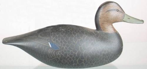 Black duck decoy made by Alberto "Bert" Williams, Orleans, MA. Solid body, glass eyes and very nice paint style. Branded on the bottom with "AW" and dated 1981. XOC. (decoy)
