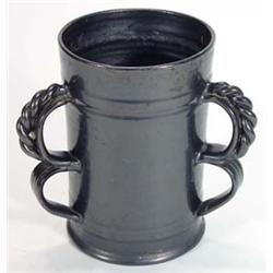 Black glazed Dicker pottery tyg with rope twist handles, 17cm high, impressed marks to base…