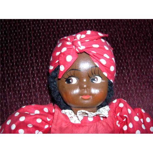 This is a 15" Black doll with a molded mask face. It has painted features and black yarn for the hair.I'm guessing she is from the 1950-1960's. She has pieces of tan felt around her legs with tiny black beads to denote her high button shoes. The snaps on her clothing are round and their is machine stitching as well as handstitching. Her red and white polka dots is very colorful. She's from a smoke free environment. Buyer to pay $10 for shipping, insurance and handling. Thanks for viewing.