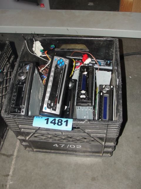 Black milk crate of assorted car stereos