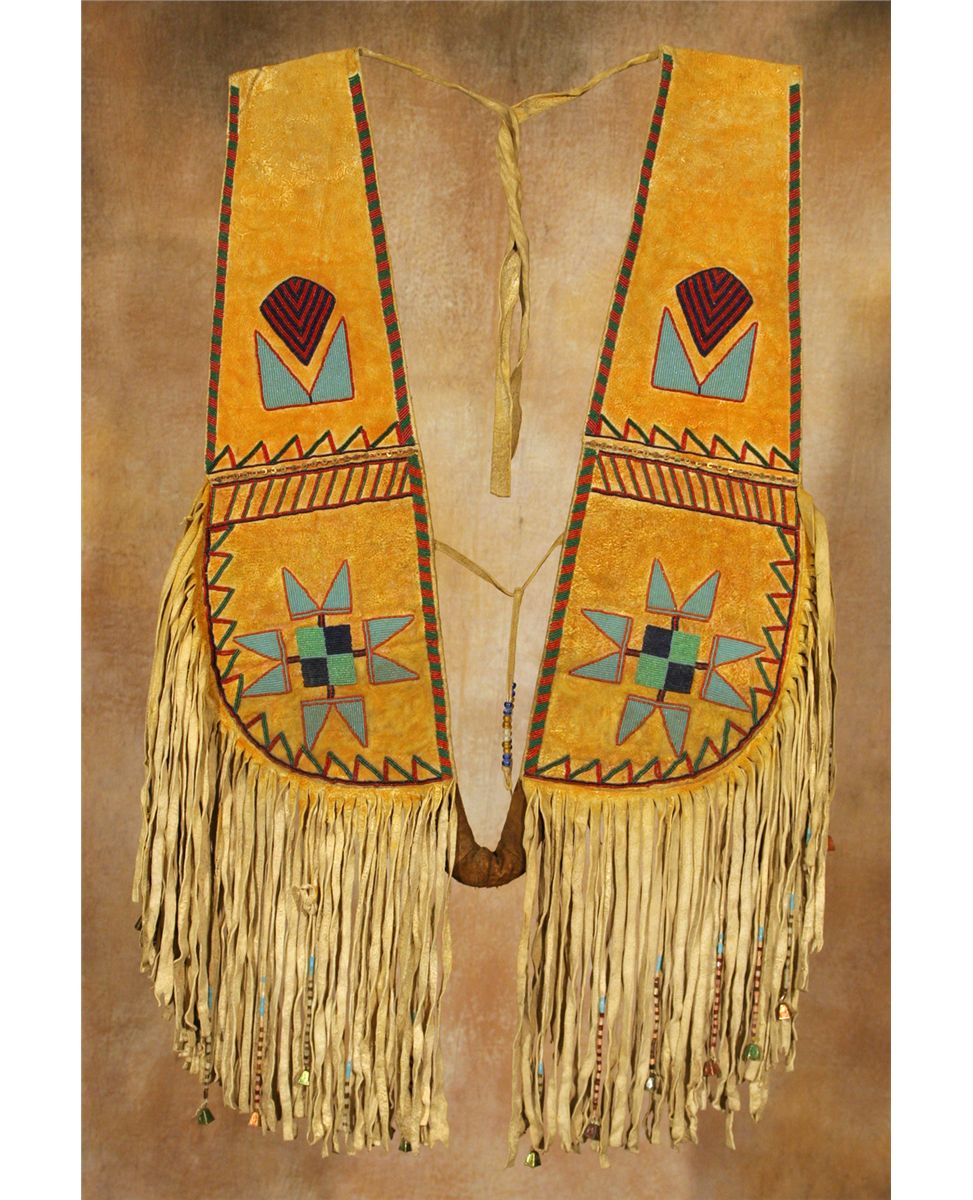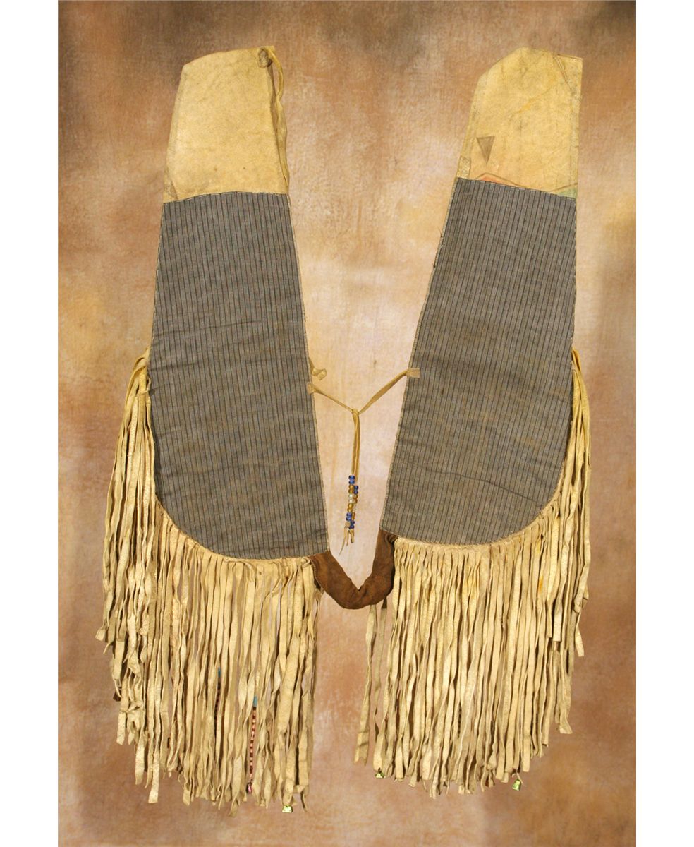 Blackfoot Crupper. Two 27" x 9.5" panels exhibiting finely beaded patterns and yellow pigment. Beautiful long fringe measuring 15". Several of the fringe slats are bugle beaded and end in a hawk bell. A fabulous early 20th century piece made by Melinda Chuguette Wren (1846-1940), Blood Division of Canada, Browning, MT. Provenance: Ex-Hanniman collection, Browning, MT. Collection of Dr. Delwin and Karen Bokelman, PA., and pictured in their book Precious Dreams, page 26.