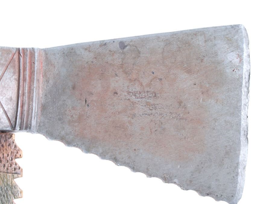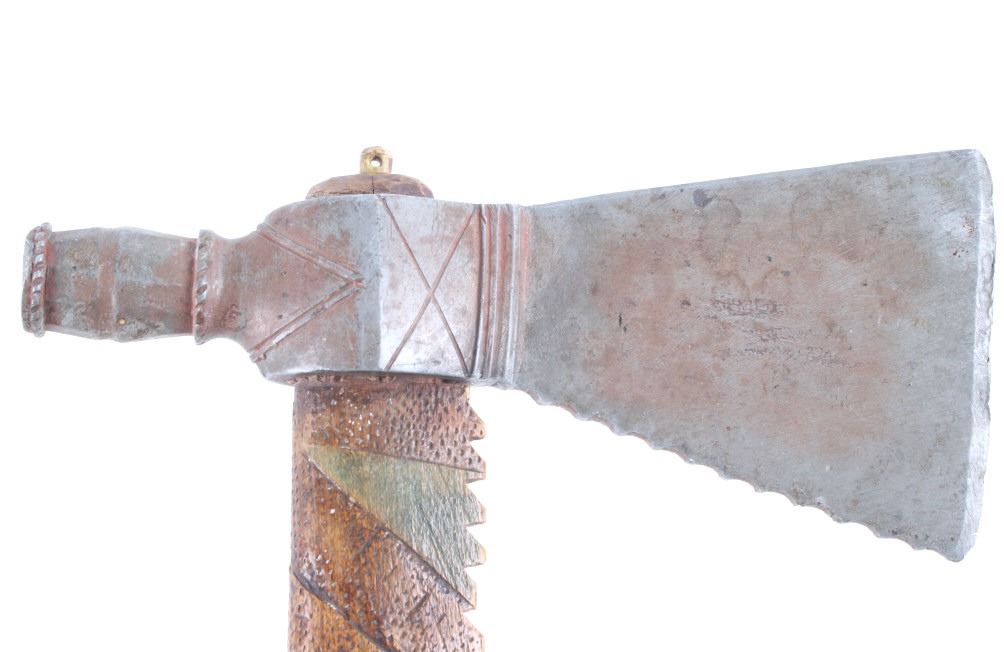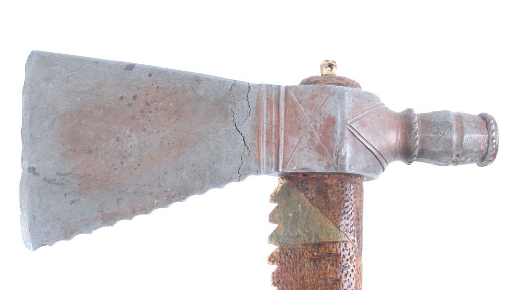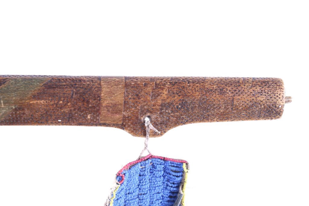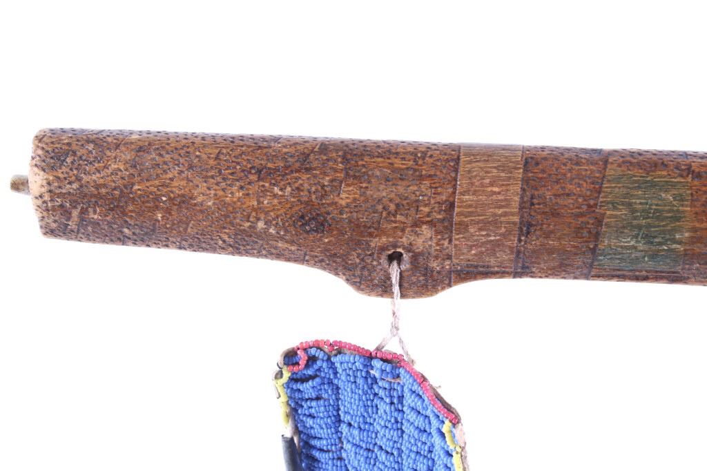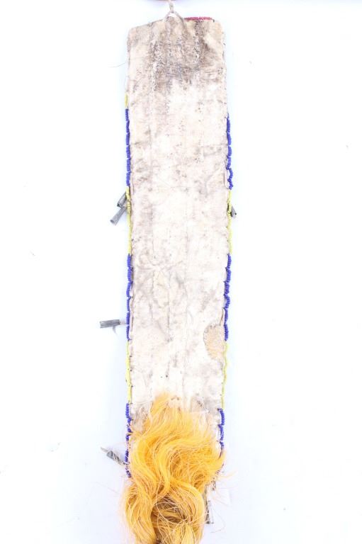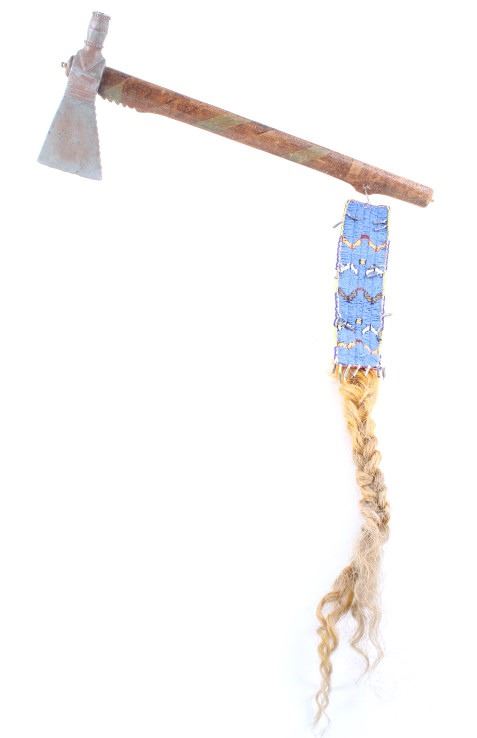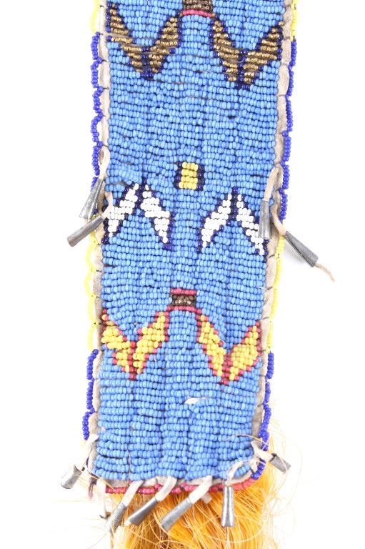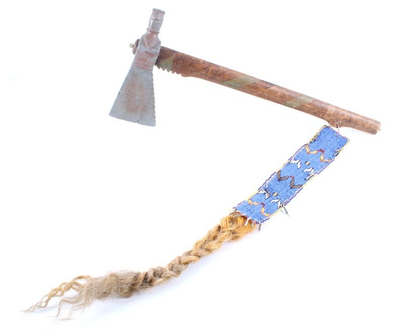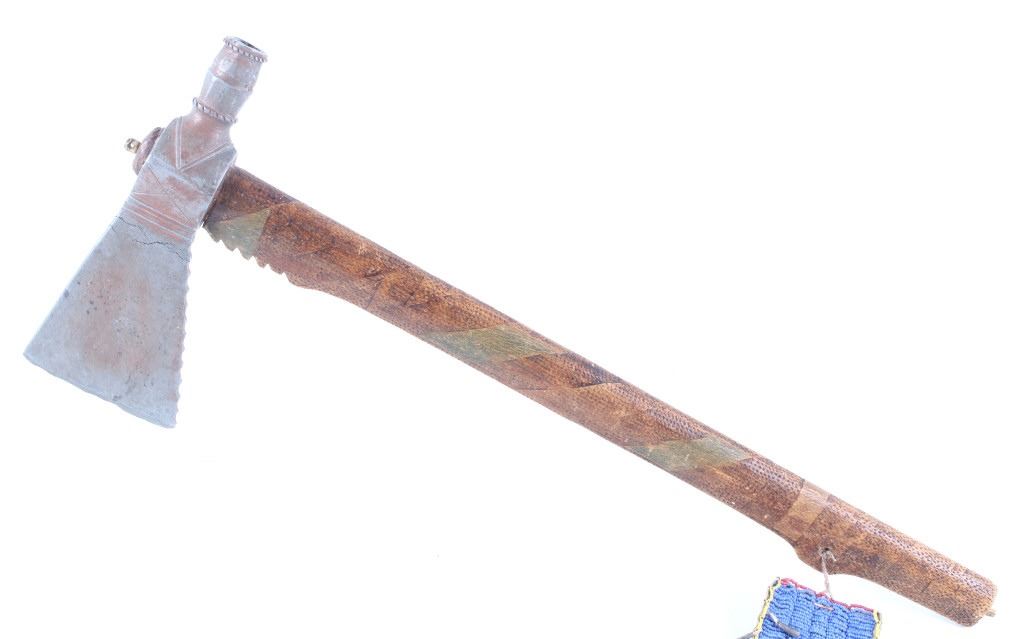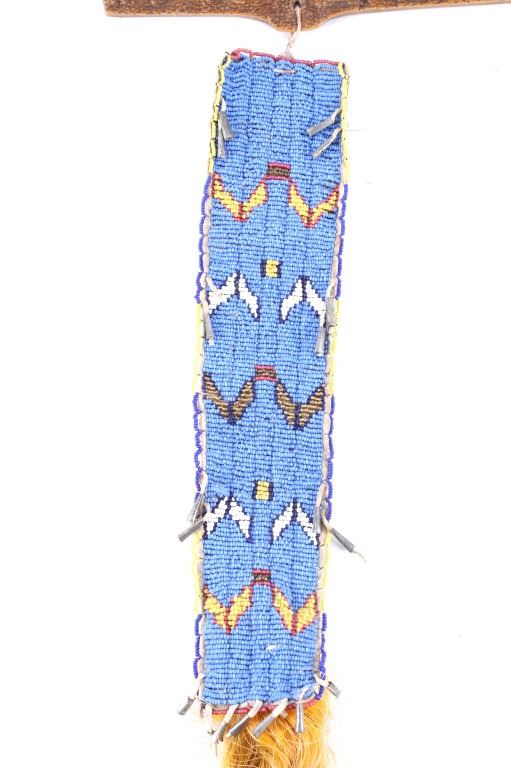 The lot features a fine Western pipe tomahawk with solid pewter head, intricately file burned and polychrome painted handle and beaded drop from the Northern Plains Native American Indians of the 19th Century. The piece is likely from the Blackfoot (Blackfeet) people and is similar in its solid pewter make as the Blackfoot Pipe Tomahawk example sold by our company in our March 2018 sale. This example shows a cast solid pewter tomahawk axe head with file curved ridge bottom edge, file cut lines at the eyelet hole along with crisscrossing engraving, prominent engraved chevron and unique eleven sided beveled and rope etched wide pipe bowl. The head is secured to the solid, possibly ash wood, haft handle with a gasket of Indian tanned hide and is carved at the eyelet protrusion along with still holding the original bone or tooth clean out plug with pieced hole. The haft shows extensive highly detailed hot file branding covering the entire surface of the wood along with green, red and yellow ocher mineral pigment polychrome painted finish in a diagonal design. At the gripping area shows a hand stop protruding which has a pierced hole holding a beaded drop with a tie of Indian tanned hide. The beaded drop is constructed of Indian tanned hide which is covered on the front with all early period correct glass trade seed cen beads in a geometric pattern being sinew sewn. The beadwork shows a medium light blue background with greasy yellow, red white heart, cobalt, chalk white and faceted brass colors in a Buffalo Bison track, tipi or zig-zag pattern. The outside edge of the drop has a fancy beaded design and the piece shows four rows of rolled tin jingle cone fringe. The back of the beaded drop has a tied-on horse “scalp” which is braided and has a blonde coloring with orange / yellow dye. The back of the drop shows an old Indian repair. The pipe haft has a smoking tip made from an old bone or tooth. The silver pewter has a nice mellow coloring and appears to be painted red ocher at one time. The head was used with the bottom edge of the blade being slightly irregular and the piece showing a stress fracture at the eyelet hole, the piece is currently very secure and not prone to further damage. The entire piece has a nice mellow patina and is in fine presentation condition with fine craftsmanship and rich coloring. Overall measures 22”L with a 29.5”L by 2 7/8”W beaded drop. The head is 9”L with a blade that is 3.75”L.