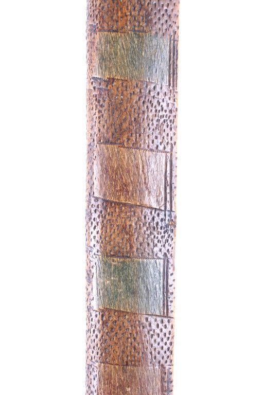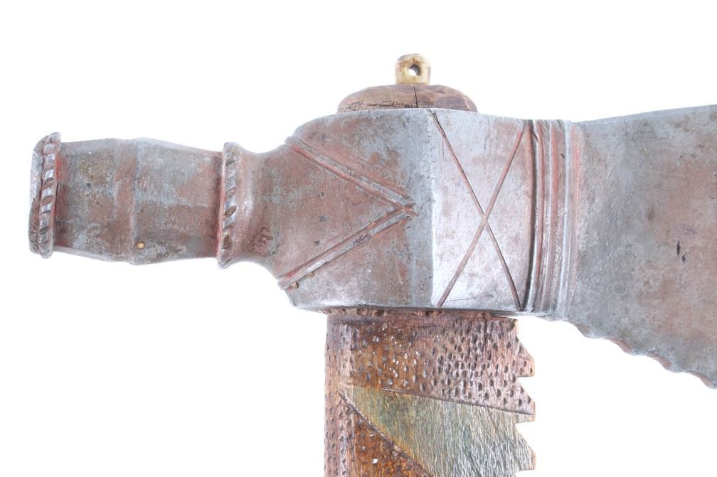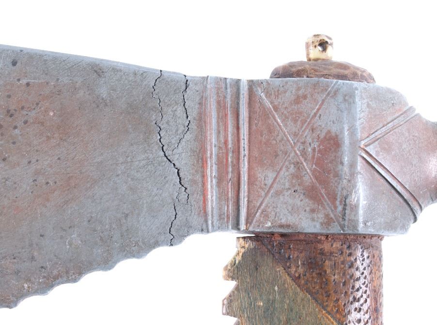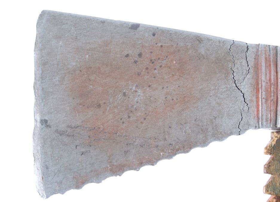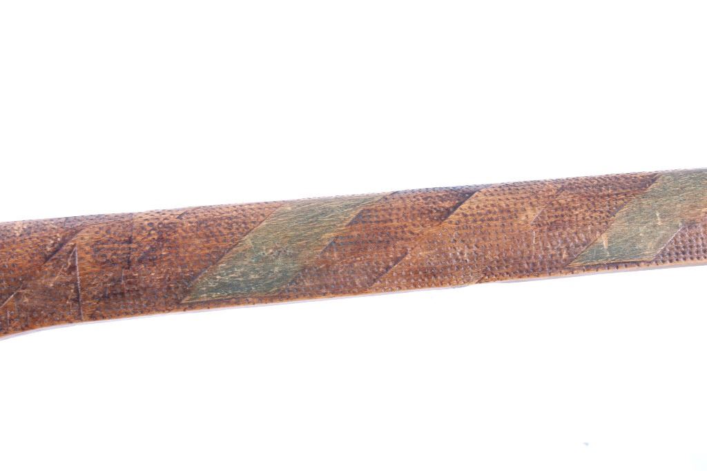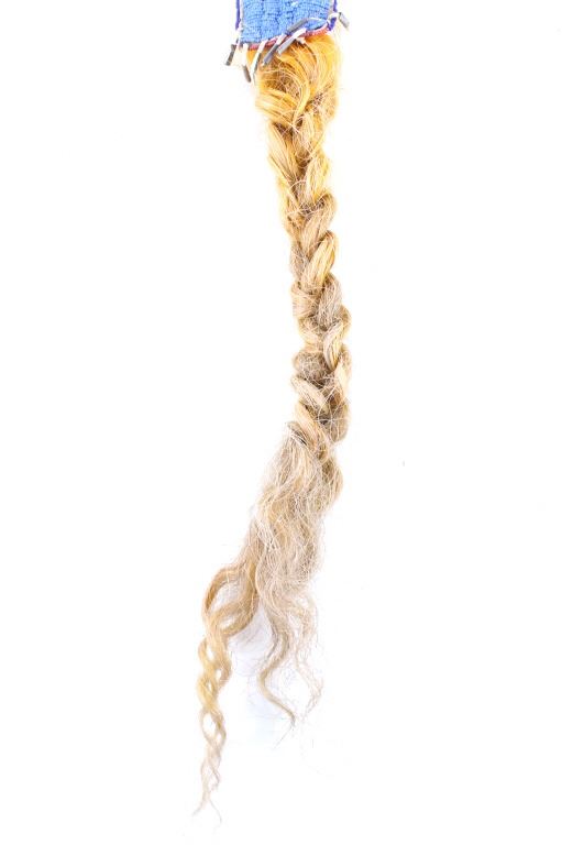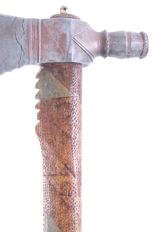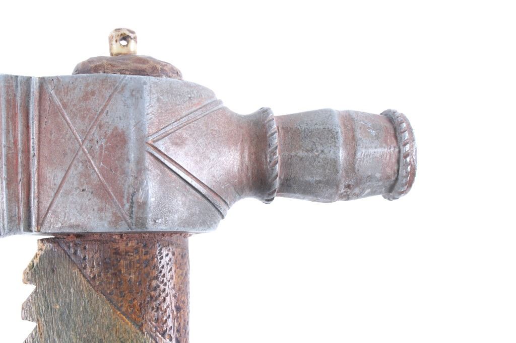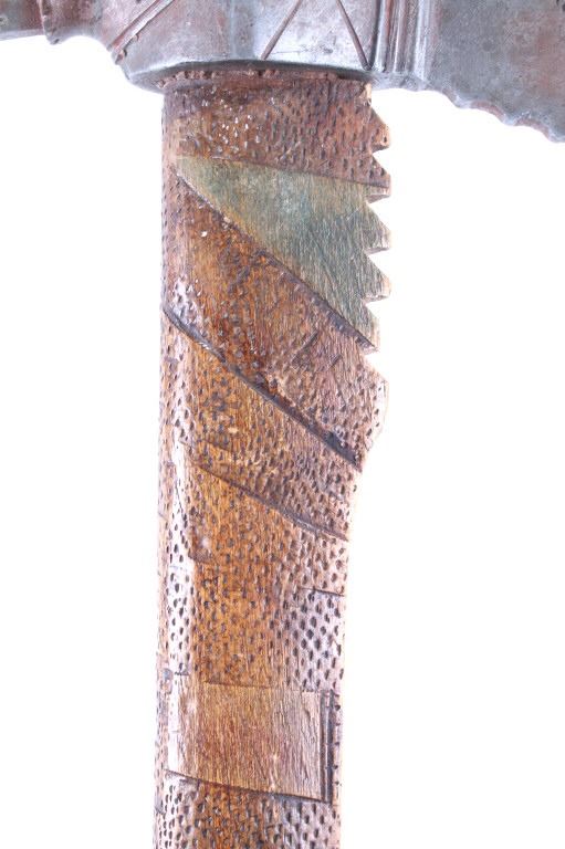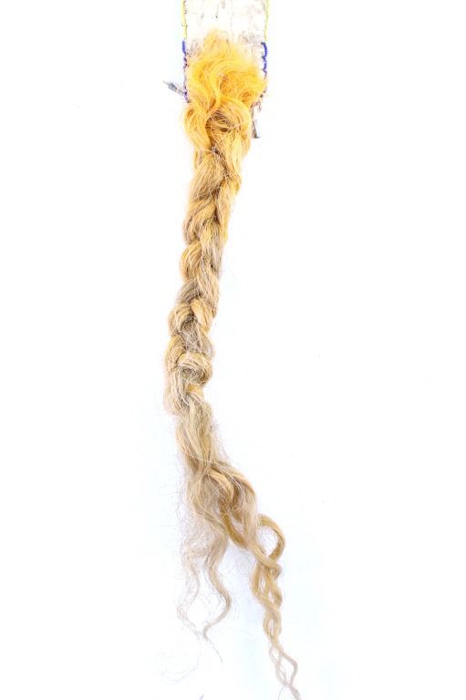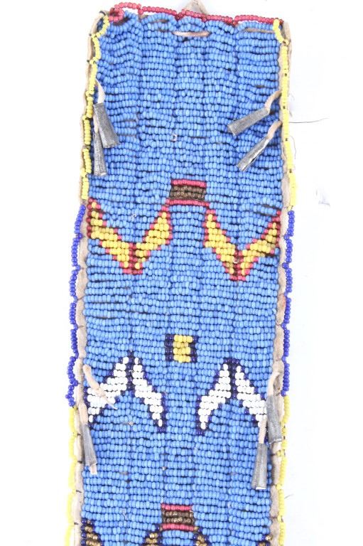 The lot features a fine Western pipe tomahawk with solid pewter head, intricately file burned and polychrome painted handle and beaded drop from the Northern Plains Native American Indians of the 19th Century. The piece is likely from the Blackfoot (Blackfeet) people and is similar in its solid pewter make as the Blackfoot Pipe Tomahawk example sold by our company in our March 2018 sale. This example shows a cast solid pewter tomahawk axe head with file curved ridge bottom edge, file cut lines at the eyelet hole along with crisscrossing engraving, prominent engraved chevron and unique eleven sided beveled and rope etched wide pipe bowl. The head is secured to the solid, possibly ash wood, haft handle with a gasket of Indian tanned hide and is carved at the eyelet protrusion along with still holding the original bone or tooth clean out plug with pieced hole. The haft shows extensive highly detailed hot file branding covering the entire surface of the wood along with green, red and yellow ocher mineral pigment polychrome painted finish in a diagonal design. At the gripping area shows a hand stop protruding which has a pierced hole holding a beaded drop with a tie of Indian tanned hide. The beaded drop is constructed of Indian tanned hide which is covered on the front with all early period correct glass trade seed cen beads in a geometric pattern being sinew sewn. The beadwork shows a medium light blue background with greasy yellow, red white heart, cobalt, chalk white and faceted brass colors in a Buffalo Bison track, tipi or zig-zag pattern. The outside edge of the drop has a fancy beaded design and the piece shows four rows of rolled tin jingle cone fringe. The back of the beaded drop has a tied-on horse “scalp” which is braided and has a blonde coloring with orange / yellow dye. The back of the drop shows an old Indian repair. The pipe haft has a smoking tip made from an old bone or tooth. The silver pewter has a nice mellow coloring and appears to be painted red ocher at one time. The head was used with the bottom edge of the blade being slightly irregular and the piece showing a stress fracture at the eyelet hole, the piece is currently very secure and not prone to further damage. The entire piece has a nice mellow patina and is in fine presentation condition with fine craftsmanship and rich coloring. Overall measures 22”L with a 29.5”L by 2 7/8”W beaded drop. The head is 9”L with a blade that is 3.75”L.