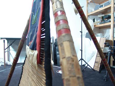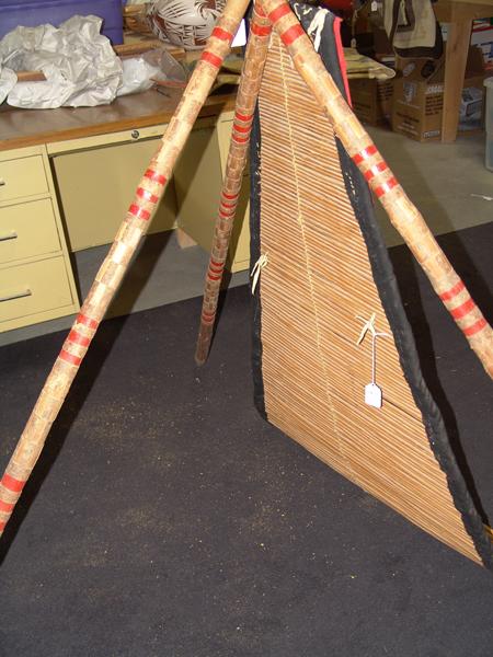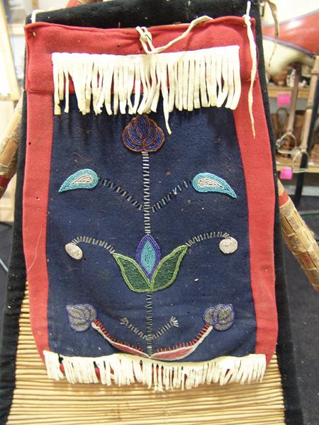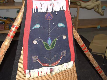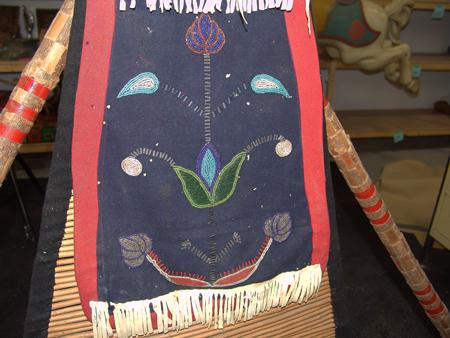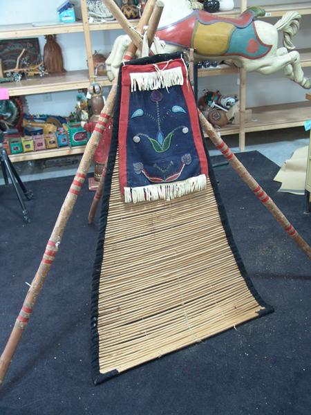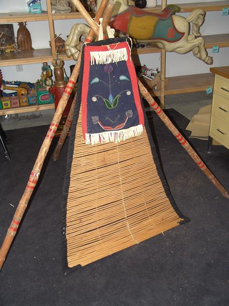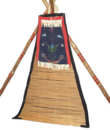 Very rare tepee "backrest" made from peeled willow and with black wool trim, beautiful floral beaded panel, and tripod stand. Condition: very good. 48" x 34"