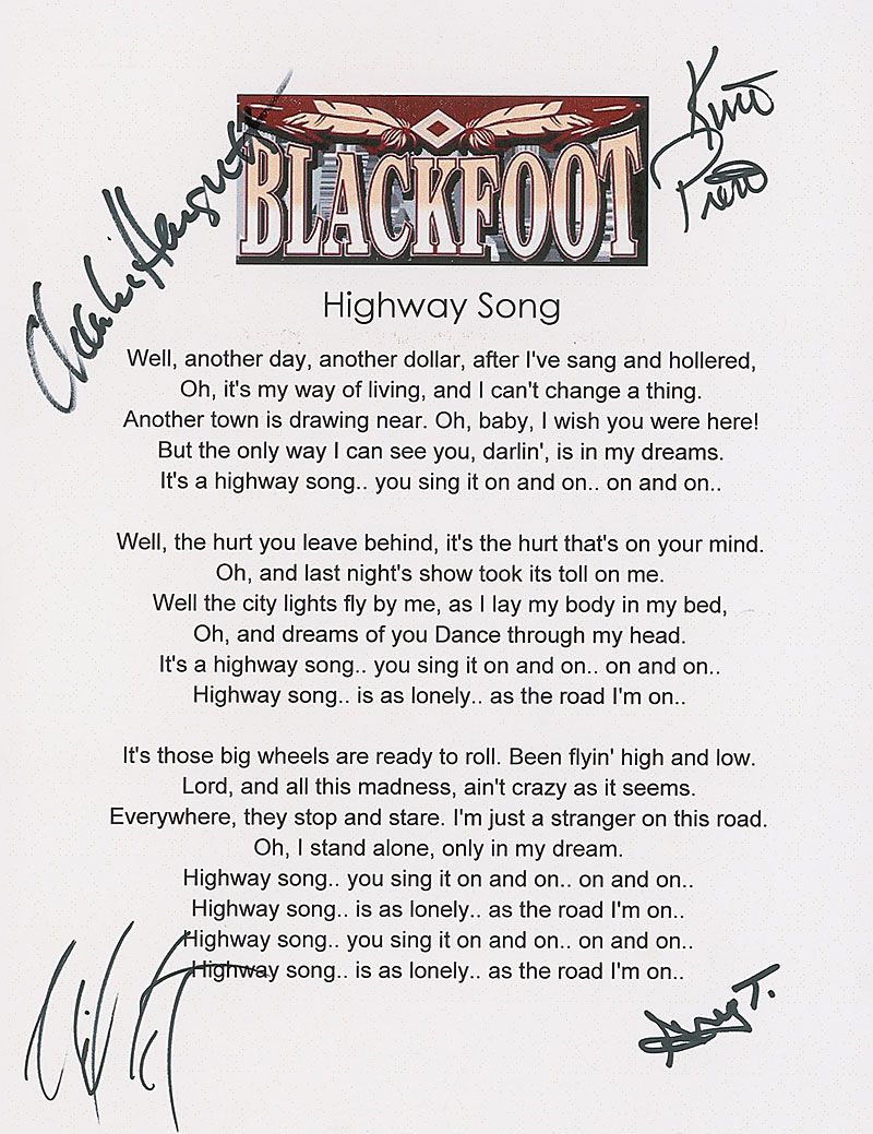 Souvenir printed lyrics to ‘Highway Song’ on a white 8.5 x 11 sheet, with the band’s logo printed at the top, signed in black felt tip by Greg T. Walker, Charlie Hargrett, Mike Estes, and Kurt Pietro. In very fine condition.