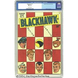 <B>Blackhawk #11 (Quality, 1946) CGC NM 9.4 Off-white pages.</B></I> This issue, only the third of the series, features Reed Crandall art. This is the highest grade that CGC has assigned for this issue to date. Overstreet 2004 NM- 9.2 value = $1,050. <BR><BR><B>Important notice:</B> Heritage usually auctions material at the rate of 200-250 lots per hour. On some occasions eBay Live bid software or the Internet may not be able to keep up with the pace of the auction. We recommend placing a realistic absentee bid now as insurance to avoid disappointment. Occasionally the auctioneer may eliminate or reject an eBay Live bid, and the auctioneer may also reopen a lot after the close of the eBay live bidding (usually because we missed an audience bid), and may reject your bid even if it shows you as the winning bidder. By bidding via eBay Live, you agree that Heritage may award the lot to another bidder at its sole discretion under the circumstances described above or any other reasonable circumstances. Since eBay bids are not shown to us until we open the lot on the floor, we treat those bids just like floor bids. In most cases the floor responds before the eBay bid is presented to us, due to Internet lag time, so for consistency we have made it a policy that floor bids are always considered first over tie eBay live bids. Also please note that all Heritage lots purchased through eBay Live carry a 20% Buyer's Premium. Please make sure you read the Terms and Conditions before you bid. </span></font></tr></table></td></tr></table>