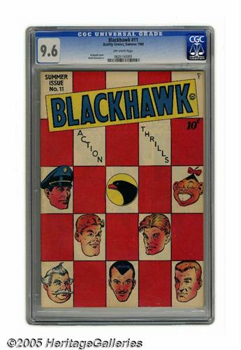 <B>Blackhawk #11 (Quality, 1946) CGC NM+ 9.6 Off-white pages.</B></I> A great checkerboard cover sets this book off from the rest, and is further accentuated by the book's amazing Near Mint-plus grade. Perfectly white, with deep colors and a flawless spine and edges, the book is near-unimprovable. Reed Crandall provides interior art, while Al Bryant does the cover. To date, no other copies of this issue have been graded higher by CGC. Overstreet 2005 NM- 9.2 value = $1,125. CGC census 1/05: 1 in 9.6, none higher.
