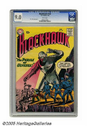 <B>Blackhawk #120 (DC, 1958) CGC VF/NM 9.0 White pages.</B></I> Robot cover by Dick Dillin. Overstreet 2005 VF/NM 9.0 value = $124; NM- 9.2 value = $165. CGC census 3/05: 1 in 9.0, none higher.