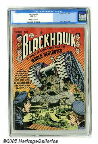<B>Blackhawk #61 (Quality, 1953) CGC NM- 9.2 Off-white to white pages.</B></I> This is the only copy of this issue that CGC has certified to date. The cover is by Reed Crandall. Overstreet 2005 NM- 9.2 value = $375. CGC census 6/05: 1 in 9.2, none higher.