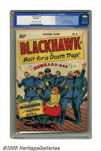 <B>Blackhawk #9 (Quality, 1944) CGC VF 8.0 Cream to off-white pages.</B></I> The Blackhawks of <B>Military Comics</B></I> fame got their own title starting with this issue, which continued the numbering from <B>Uncle Sam Quarterly</B></I>. The cover is by Al Bryant, who also contributed interior art. A very nice copy of a key book. Note that a small plastic stabilizing peg is loose inside the CGC holder, not affecting the comic, and there's also a small (1/2 inch) scratch on the side of the slab. Overstreet 2005 VF 8.0 value = $2,418. CGC census 6/05: 3 in 8.0, 4 higher.