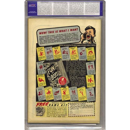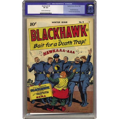 <B>Blackhawk #9 (Quality, 1944) CGC VF 8.0 Cream to off-white pages.</B></I> The Blackhawks of <B>Military Comics</B></I> fame got their own title starting with this issue, which continued the numbering from <B>Uncle Sam Quarterly</B></I>. The cover is by Al Bryant, who also contributed interior art. A very nice copy of a key book. Note that a small plastic stabilizing peg is loose inside the CGC holder, not affecting the comic, and there's also a small (1/2 inch) scratch on the side of the slab. Overstreet 2006 VF 8.0 value = $2,347. CGC census 5/06: 3 in 8.0, 5 higher. <BR><BR><B>Important notice:</B> Heritage usually auctions material at the rate of 200-250 lots per hour. On some occasions eBay Live bid software or the Internet may not be able to keep up with the pace of the auction. We recommend placing a realistic absentee bid now as insurance to avoid disappointment. Occasionally the auctioneer may eliminate or reject an eBay Live bid, and the auctioneer may also reopen a lot after the close of the eBay live bidding (usually because we missed an audience bid), and may reject your bid even if it shows you as the winning bidder. By bidding via eBay Live, you agree that Heritage may award the lot to another bidder at its sole discretion under the circumstances described above or any other reasonable circumstances. Since eBay bids are not shown to us until we open the lot on the floor, we treat those bids just like floor bids. In most cases the floor responds before the eBay bid is presented to us, due to Internet lag time, so for consistency we have made it a policy that floor bids are always considered first over tie eBay live bids. Also please note that all Heritage lots purchased through eBay Live carry a 22.5% Buyer's Premium. Please make sure you read the Terms and Conditions before you bid. This lot is being auctioned in conjunction with a live floor auction by Heritage Auction Galleries. All final auction and invoice information will be supplied by Heritage Auction Galleries, and all other information should be considered preliminary. Lot:41001 <BR><BR><B>Winning Notification and Billing:</B> After the FINAL session in this auction is complete, Heritage will send e-mail and snail mail invoices. This process normally takes several days. All final auction and invoice information will be supplied by Heritage Auction Galleries, and all other information should be considered preliminary. <BR><BR>This auction will be conducted on a live auction floor and over the Internet through eBay Live. If you choose to place an absentee bid, please take a moment to <font color='#0000ff'><u><a href='http://pages.ebay.com/liveauctions/help/before/laabsentee.html'>learn how eBay Live absentee bidding works</a></u></font><font color='#000000'>