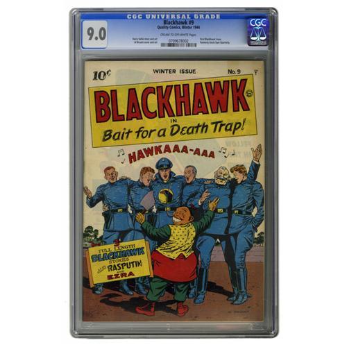 <B>Blackhawk #9 (Quality, 1944) CGC VF/NM 9.0 Cream to off-white pages.</B></I> After eight issues of <B>Uncle Sam Quarterly</B></I>, this is the first issue to bear the title <B>Blackhawk</B></I> on the masthead. Chop-Chop and the Blackhawk team celebrate their takeover with a sing-along on this cover drawn by Al Bryant, who also contributed interior art. The Ezra back-up story is written and drawn by Harry Sahle. This sharp copy is well centered, with smooth, flat surfaces. Overstreet 2006 VF/NM 9.0 value = $3,974; NM- 9.2 value = $5,600. CGC census 3/06: 1 in 9.0, 2 higher.