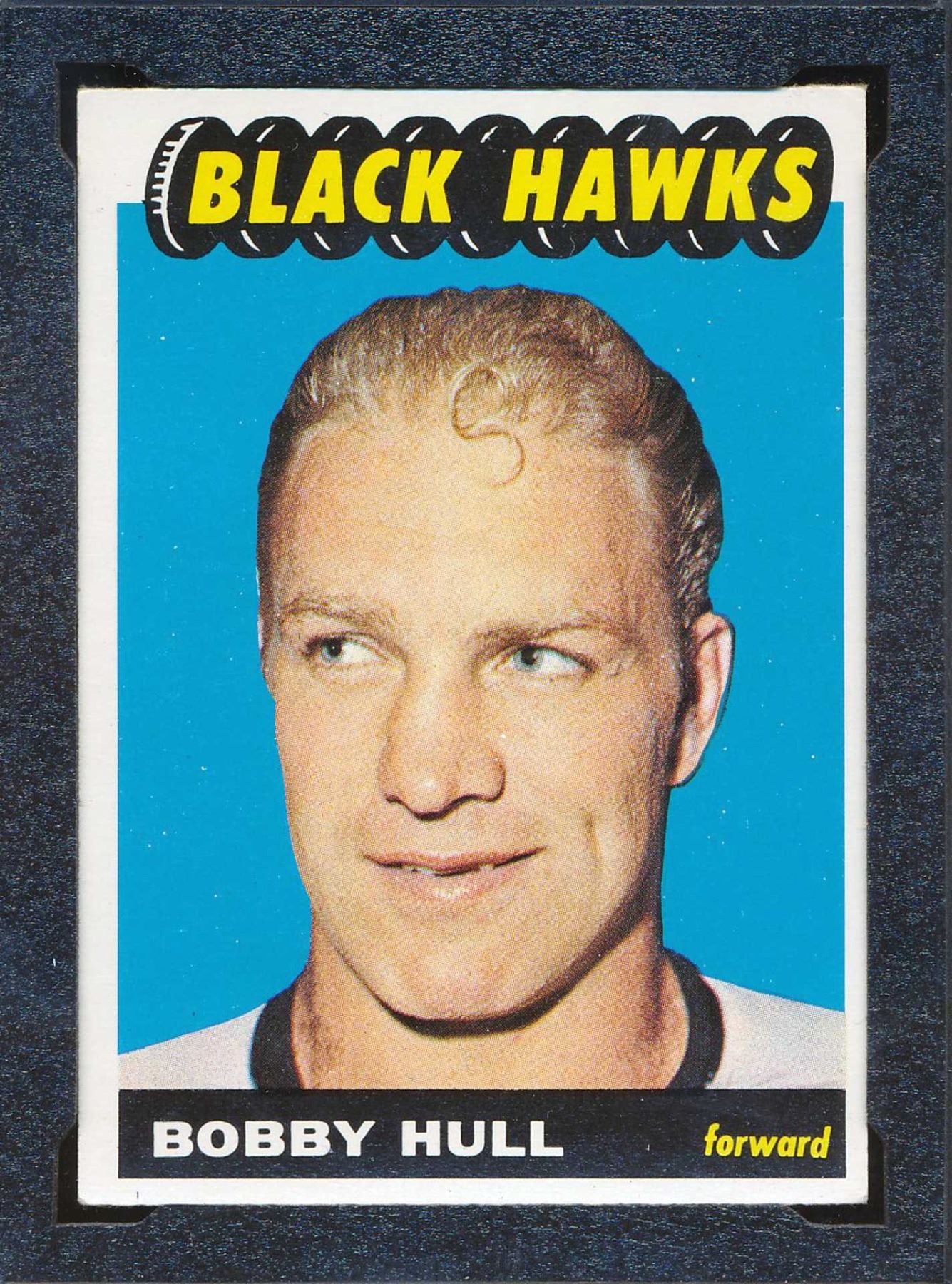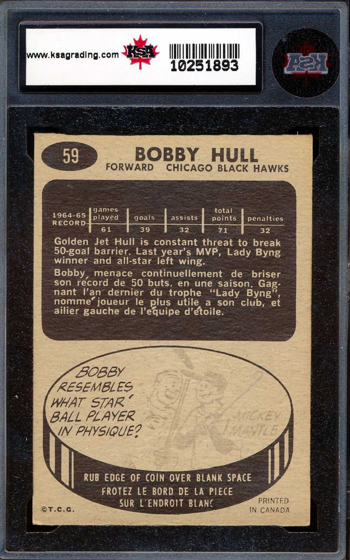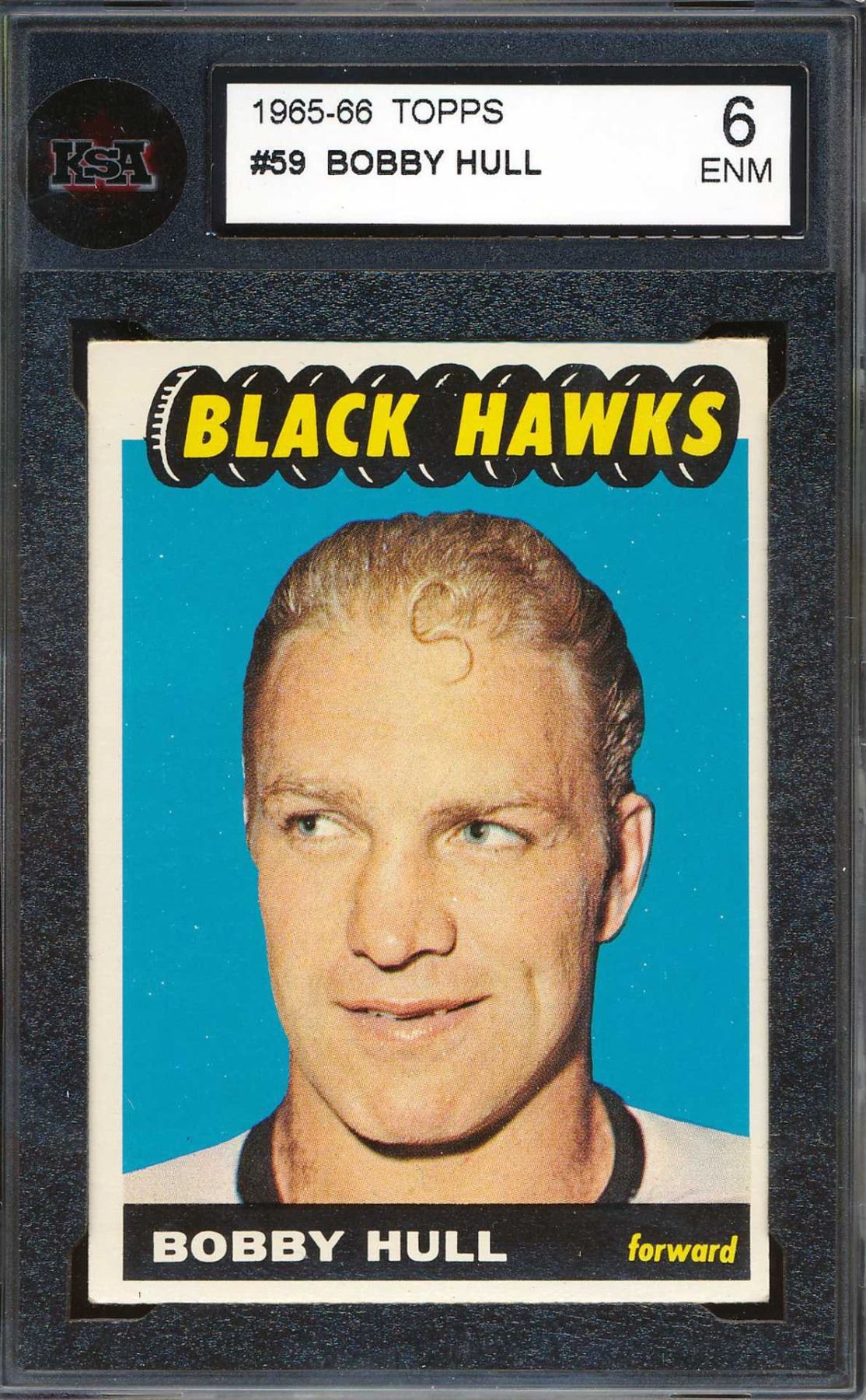Blackhawks Bobby Hull #9, (1965-66) Card # 59, printed by Topps graded KSA: ENM-6.
