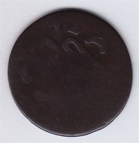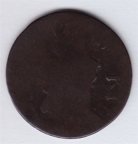 Bust R, ins./Harp L, ins. N.S. 5.54 grams. Obv. shows bottom of G, lower part of III, and REX. The E is retrograde. The harp is very weakly struck, and also worn; letters NIA visible. The specimen from the Mabbott Collection is presently in the Bank of Canada Collection; another sold at B & M Sale, March, 1987; another, nicer specimen than this one was sold in the Ringo Sale at Stack's, lot 6014, for $2990.U.S., plus buyer's premium. Fine, but for three old obv. dents.
