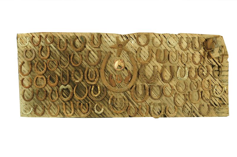 Blacksmith's Horse Shoe Sample Board out of the blacksmith shop in The Grove Texas. Measures 7' 7" x 3'