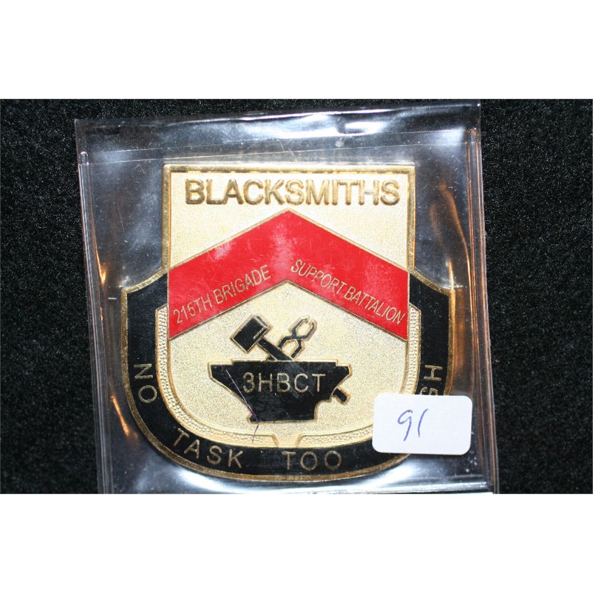 Blacksmiths 215th Brigade Support Battalion, No Task too Touch, Warriors First Logtsticians Always Challenge Medal
