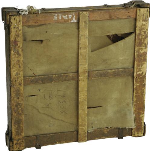 <B>Blackstone Botania Table.</B></I> Used by Harry Blackstone Sr. in the 1920 "Enchanted Garden" performances as the table upon which the "Girl to Flower Botania" illusion rested. Included are the original wood-and-canvas packing materials and crate. It measures 31" x 33" and is in good condition.