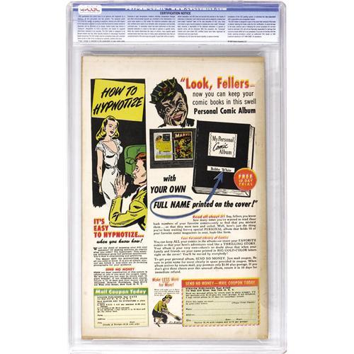 <B>Blackstone, the Magician #2 Davis Crippen ("D" Copy) pedigree (Timely, 1948) CGC VF/NM 9.0 Off-white pages.</B></I> Includes a story featuring the Blonde Phantom. One of only two copies graded by CGC at the time of this writing; the other is graded GD/VG 3.0. Overstreet 2006 VF/NM 9.0 value = $614; NM- 9.2 value = $840. CGC census 7/06: 1 in 9.0, none higher. <I>From the Crippen Collection.</B></I> <BR><BR><B>Important notice:</B> Heritage usually auctions material at the rate of 200-250 lots per hour. On some occasions eBay Live bid software or the Internet may not be able to keep up with the pace of the auction. We recommend placing a realistic absentee bid now as insurance to avoid disappointment. Occasionally the auctioneer may eliminate or reject an eBay Live bid, and the auctioneer may also reopen a lot after the close of the eBay live bidding (usually because we missed an audience bid), and may reject your bid even if it shows you as the winning bidder. By bidding via eBay Live, you agree that Heritage may award the lot to another bidder at its sole discretion under the circumstances described above or any other reasonable circumstances. Since eBay bids are not shown to us until we open the lot on the floor, we treat those bids just like floor bids. In most cases the floor responds before the eBay bid is presented to us, due to Internet lag time, so for consistency we have made it a policy that floor bids are always considered first over tie eBay live bids. Also please note that all Heritage lots purchased through eBay Live carry a 22.5% Buyer's Premium. Please make sure you read the Terms and Conditions before you bid. This lot is being auctioned in conjunction with a live floor auction by Heritage Auction Galleries. All final auction and invoice information will be supplied by Heritage Auction Galleries, and all other information should be considered preliminary. Lot:41001 <BR><BR><B>Winning Notification and Billing:</B> After the FINAL session in this auction is complete, Heritage will send e-mail and snail mail invoices. This process normally takes several days. All final auction and invoice information will be supplied by Heritage Auction Galleries, and all other information should be considered preliminary. <BR><BR>This auction will be conducted on a live auction floor and over the Internet through eBay Live. If you choose to place an absentee bid, please take a moment to <font color='#0000ff'><u><a href='http://pages.ebay.com/liveauctions/help/before/laabsentee.html'>learn how eBay Live absentee bidding works</a></u></font><font color='#000000'>