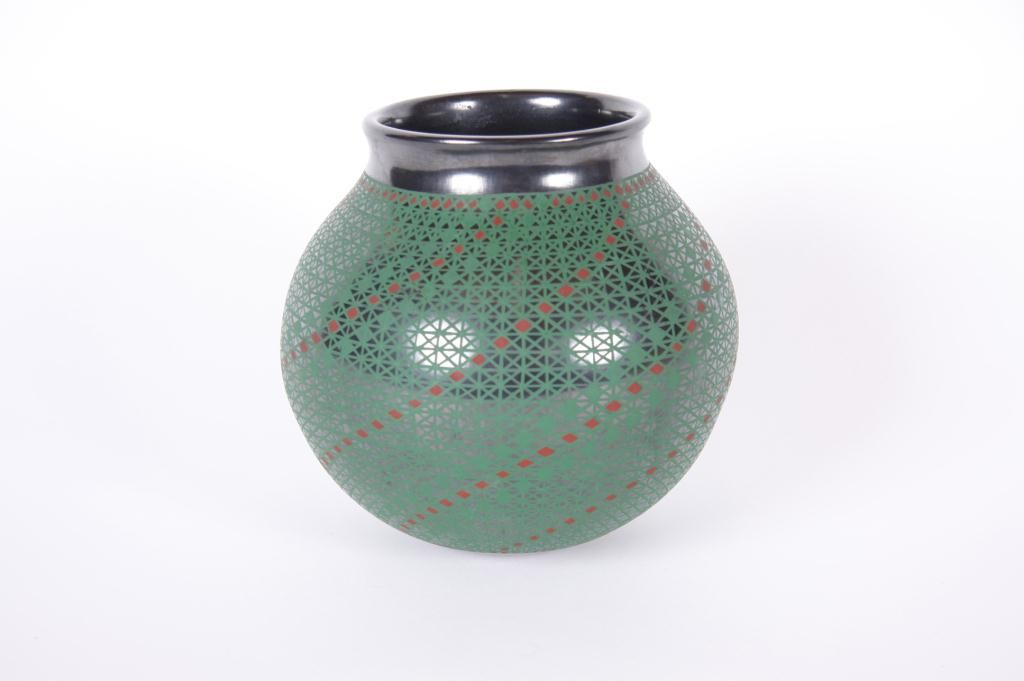 Blackware Pot by Guadalapue Diffineros6" X 6". Polychromed in a Geometric pattern in Green & Red. Signed on base.