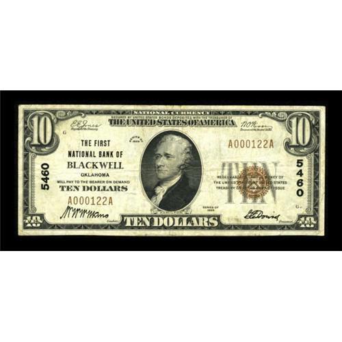 <B>Blackwell, OK</B></I> - $10 1929 Ty. 1 <B>The First NB</B></I> Ch. # 5460<BR> An attractive and evenly circulated example from the only issuer of Series 1929 notes in this Kay County location. Pleasing <B>Fine-Very Fine</B></I>.<BR><BR><b>Shipping:</b> Coins & Currency (<a target="_blank" href="http://www.heritageauctions.com/common/shipping.php">view shipping information</a>)