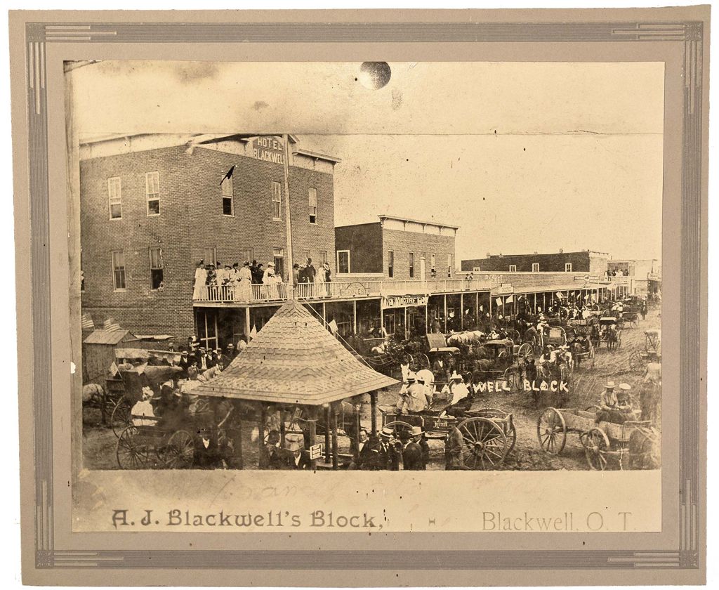 The photo shows a celebration on the town’s main street, with women in long white dresses and hats and men in suits standing on the balcony of the Hotel Blackwell and the boardwalks and street filled with people and carriages. Blackwell Block is printed in white ink on the face of the photo in the foreground. The photo is matted on gray matting board, and measures 6 ½ x 9 ½.” Andrew Jackson Blackwell was an interesting character in Oklahoma history. Born in 1842 in Mississippi, he married a part-Cherokee woman named Rosa Vaught, which fact enabled him to buy property and lay out a town in Indian Territory. He secured the allotments of three eighties (acres) and when the Cherokee Strip opened to settlement on September 16, 1893, the town of Blackwell Rock had already been laid out, surveyed and plotted. Its new inhabitants soon dispensed with the Rock part of the name, simply calling their town Blackwell. He later founded another town named David and a third named Chelsea, both in the Cherokee Nation. A.J. became a wealthy man. He died on June 25, 1903, leaving his widow and three children. [Ref: www.kaycounty.info/PGS/ObitsB/BlackwellAJ_DN.htm and Wikipedia].City: Blackwell RockCounty: KayState: OK