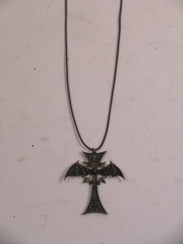 Worn by background actors in the 1998 film 'Blade', starring Wesley Snipes and Stephen Dorff. This necklace is shaped like a crucifix, with an engraved vertical piece, and a horizontal piece that resembles a bat. On the back, the words, "Made in England. The Alchemy Carta. Premier 1995," are engraved. (Measures approx. 2.25" x 0.25" x 2.5")