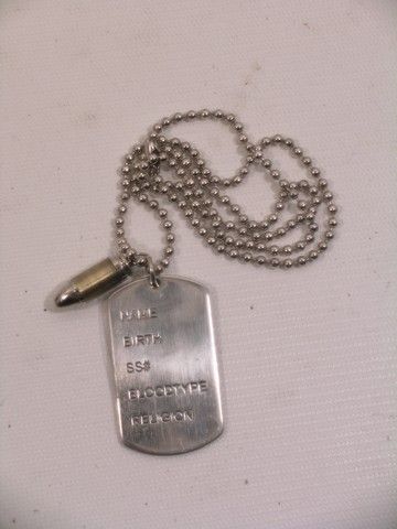 From the set of vampire action film 'Blade' (1998), starring Wesley Snipes and Kris Kristofferson. Half human, half vampire Blade (Snipes) fights the evil undead for the good of mankind. Prop is a dog tag and bullet connected by a necklace, used in the background during the dance hall scene. Dog tag is metallic, with "NAME, BIRTH, SS#, BLOODTYPE, RELIGION," engraved on the front. The bullet is metallic, but not live ammunition. Prop has some light wear from being on set. (Dog tag measures approx. 1.5" x >1" x 2". Bullet measures approx. .5" x 1" x >.5")