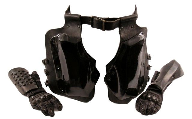 Blade II Bloodpack Hand And Leg Armor Costume - In "Blade II" (2002) the second in the box office hit of "Blade" movies starring Wesley Snipes, repeating his title role, and directed by legendary horror-action director Guillermo del Toro, Blade must deal with a new powerful group of ultra-vampires called the Reapers. He enlists the help of Bloodpack, a group of vampire warriors and assassins who were originally his enemy. These are a pair of screen used Bloodpack armor gloves and leggings. They were most likely worn by Rheinhardt (Ron Perlman). They are beautifully detailed in leather, industrial hard plastic and Velcro. (Hand Armor is approx 16" x6", Legging Armor is approx 18"x11".)