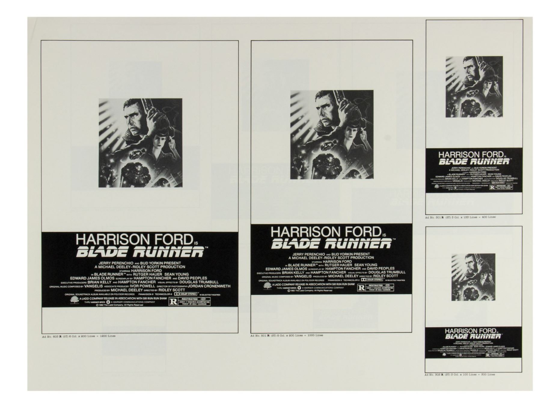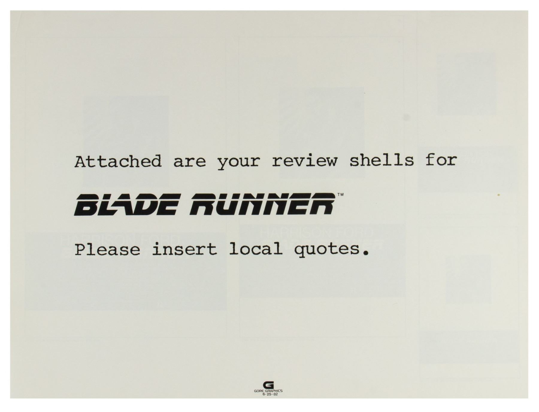 (Warner Bros, 1982) A rare advertising campaign book that was created for the release of "Blade Runner" in order to help promote the film. The book contains "review shells" with 5 large sheets of poster imagery to be used in advertising. Created by Gore Graphics with a date of 6-25-82, the book measures 19"x25" and is in very good condition with some creasing around the edges.