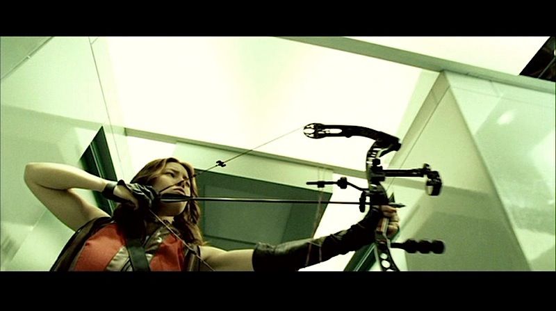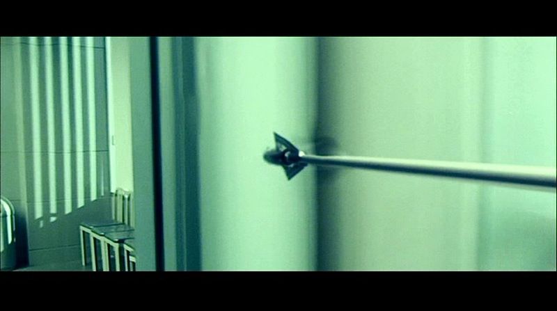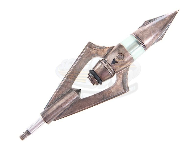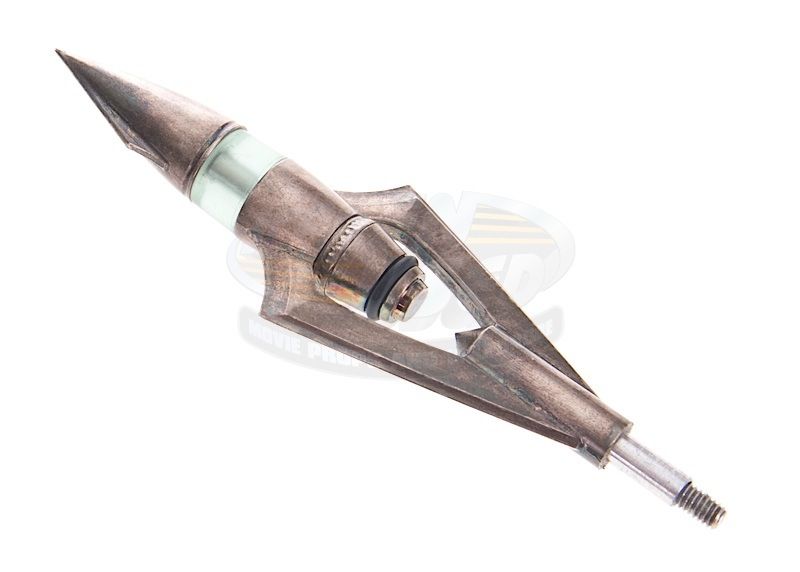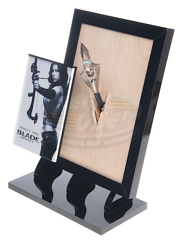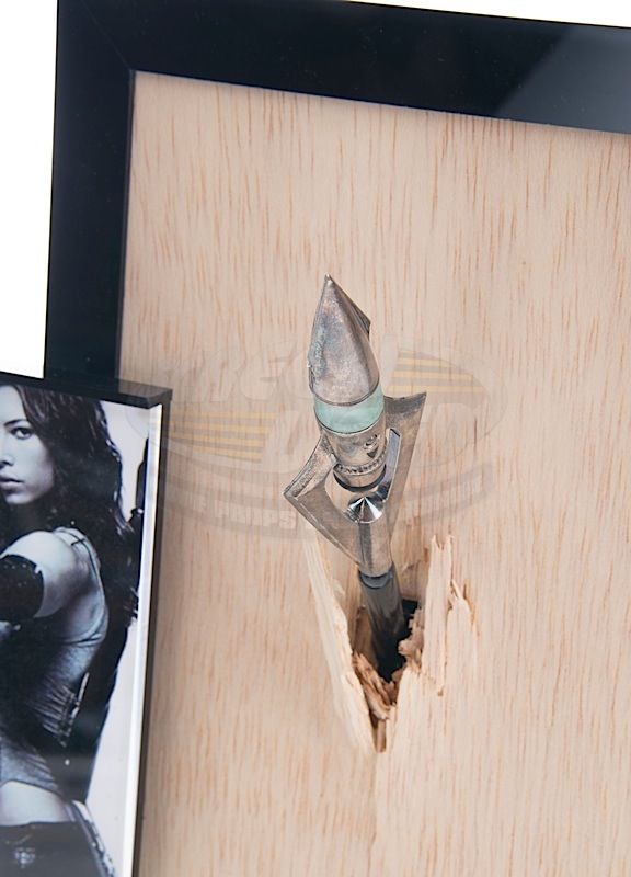 (New Line Cinema, 2004) This hero arrow tip was made by the production for use by Jessica Biel as "Abigail" and can be seen periodically throughout the film in close up shots. It is a metal arrow tip with a clear area in the center and measures 5 inches in length. The arrow tip is presented on a custom acrylic and wood stand for display that measures 13" tall x 10.5" wide. Along with our ScreenUsed COA, this piece comes with a New Line Studios COA.