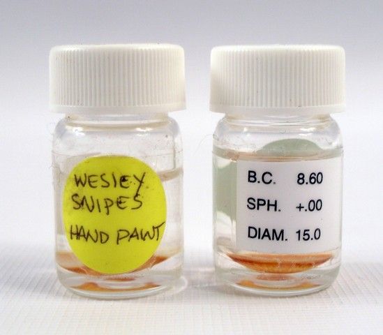 Wesley Snipes confronts enemies from all ends of the world in the last chapter of his "Blade" trilogy, "Blade: Trinity" (2004). Having been framed, he is not only a wanted man by the FBI and the Police Department, as well as the whole vampire nation, but he also has to contend with his most worthy adversary to date: Dracula himself! Besides his trademark fangs, Blade, being half-vampire, also has iconic blood-red eyes. These are a pair of his actual hand-painted blood-red contacts that he wore in the film. Because of the sensitive nature of such make-up devices, they must be made and applied by licensed optometrist. This hero pair of Wesley Snipes' vampire eyes are in their original saline solution bottles, and packed in the original container of the Optometrist Lab in Los Angeles where they were created by Dr. Morton K. Greenspoon, Dr. Richard L. Silver and Dr. Stacy Sumner.