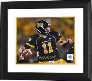 Blaine Gabbert had a stellar debut in 2009, he was given the reins to the offense and immediately showcased his talent as the first-string man under center for the Tigers, throwing for more than 300 yards and three touchdowns in his debut as the starter, while finishing the season as one of the highest-rated passers in the nation and forming a notable connection with wideout Jeremy Maclin, who ended the ‘08 campaign with over 1,200 yards through the air and was eventually drafted by the Eagles. As a junior, he put up similar statistical totals while improving his accuracy and led Missouri to a 10-win season before announcing that he would forgo his senior season and enter the 2011 NFL Draft as one of the country’s top up-and-coming quarterback prospects. Private Signing 4/23/2011. Blaine Gabbert has hand signed this Missouri Tigers 8x10 Photo. Custom White Mat and Premium Black Frame as shown. Photo of the Signing and Certificate of Authenticity from Athlon Sports.