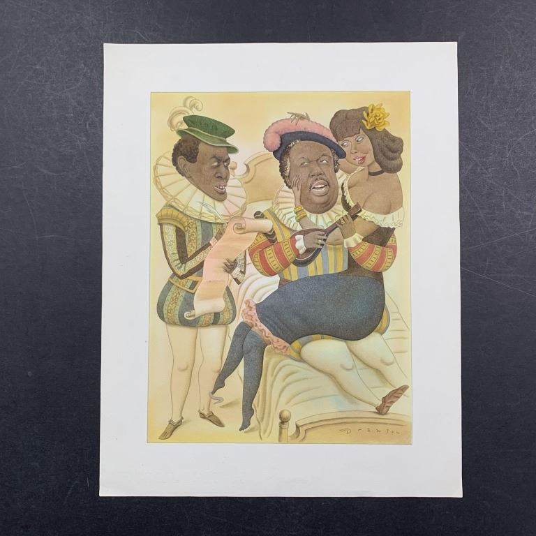 An original print by Blair Drawson of a man playing a ukelele with a spot sitting on his lap. There is a scribe who standing beside them who is writing on a scrolled piece of paper. This piece is in excellent condition.