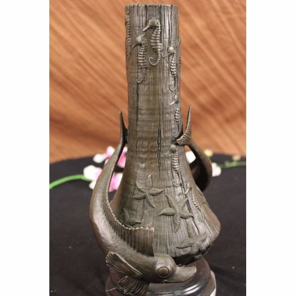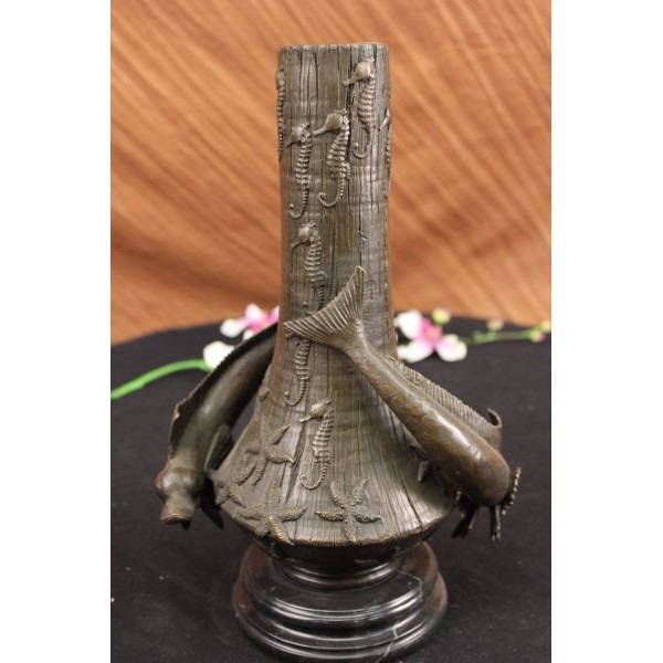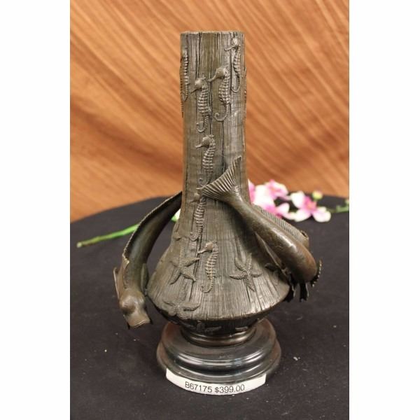 It's an underwater discovery. Two curious fishes circle a vase thathas sunk to their ocean floor. Starfish and seahorses have alreadymade this vase their home, clinging to its sides. The fishes brushalong the sides cautiously, inspecting the strange artifact. Carefullydetailed, you can feel the scales of the fish and seahorses and thegentle bumps of the starfish. It is a perfect gift for any mariner'svessel. This brown patina sculpture, whichis mounted on a black marble base, was cast using the Lost Wax Method. Bronze Dimensions with Marble Base: Height 13 X Width 9 inches. Weight: 9 LBS.