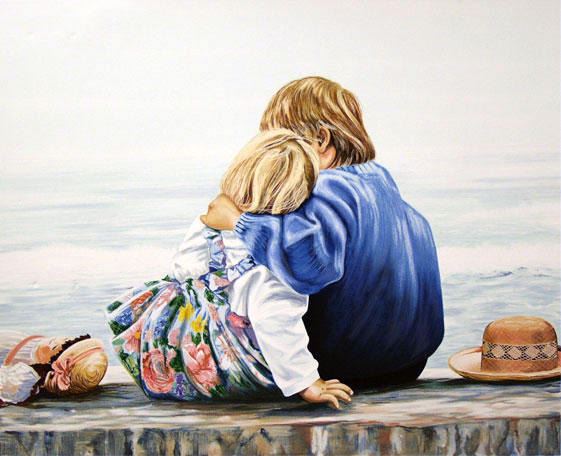 One of America's best loved artists in the 1980's and 90's, Susan Rios was known for her charmingly detailed images of adorable little children in pixcturesque settings. "Blake & Alex" was her most sought after image . It captures the pure love between two young children sharing a quiet moment together at the beach. Serigraph on paper #79/295 22x27.5 image size. Signed in pencil .