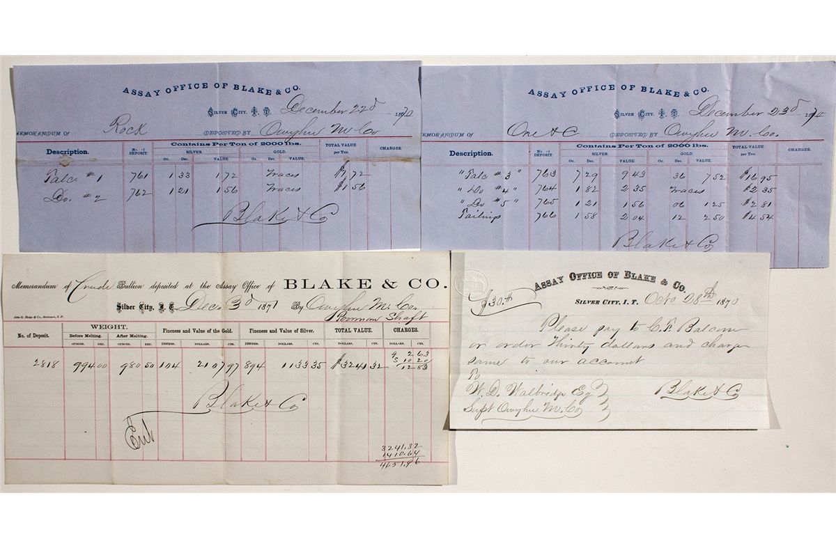 1870 Lot of 4 pieces—3 assay sheets and one handwritten check for the Owyhee Nevada Co. mine datelined Silver City, I.T. There is a nice biography of Gorham Blake (1829-1897) and Blake & Co.’s history in Don Kagin’s “Private Gold Coins and Patterns of the United States,” 1981, Arco Publishing, Inc. of NY. Lynn Langdon Collection - HKA#66270